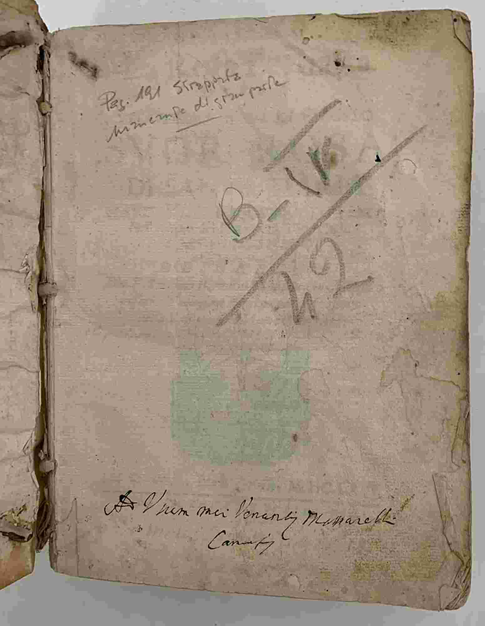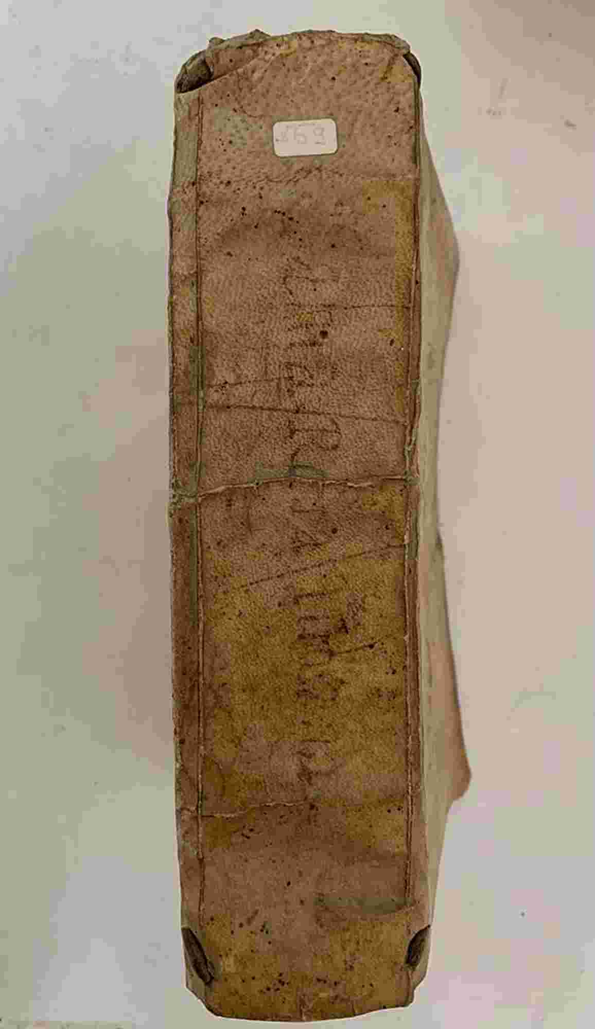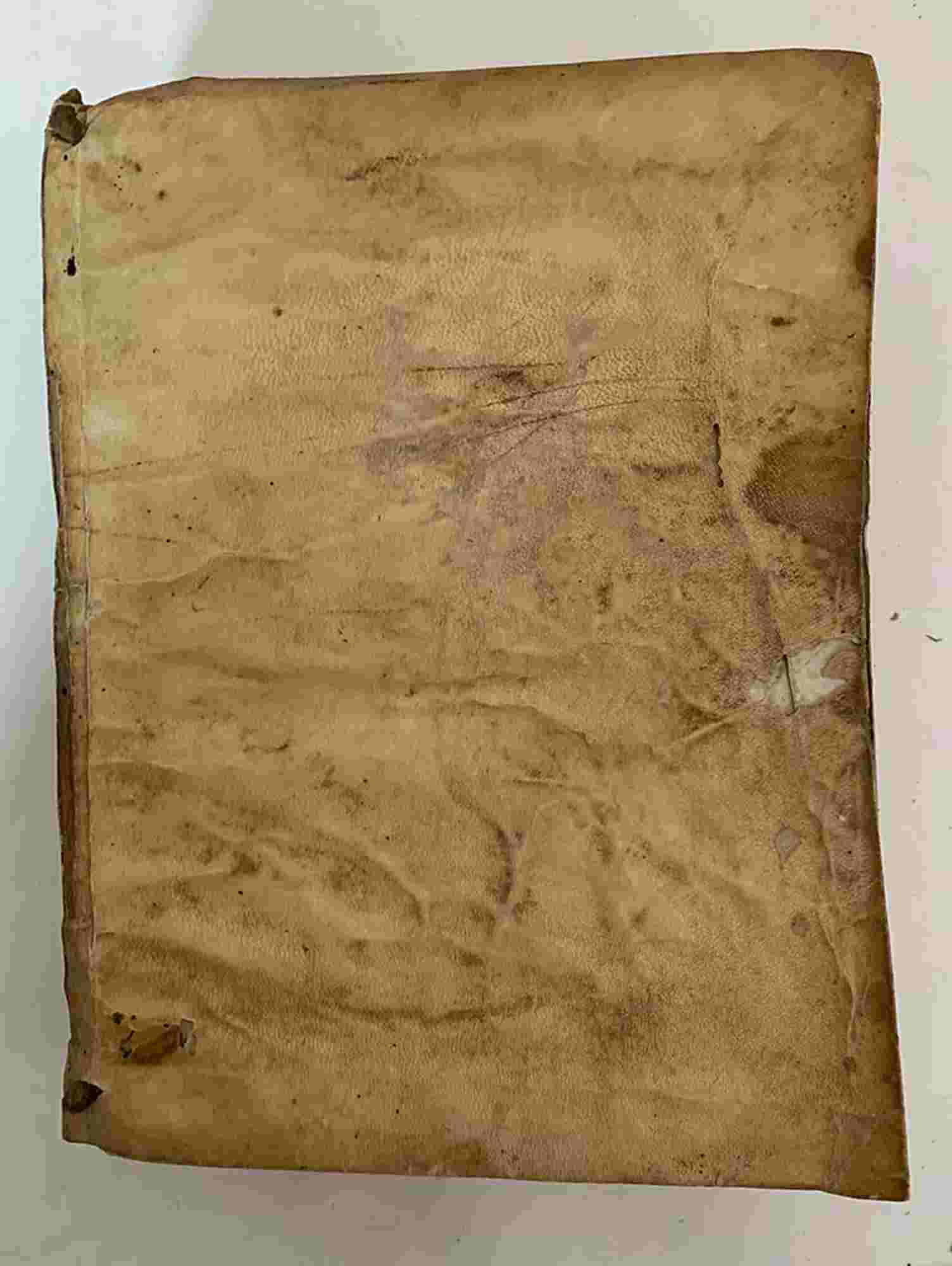 Contemporary limp vellum, with handwritten title on the spine, partially disbound. Slight waters stains all over the book, otherwise good copy.