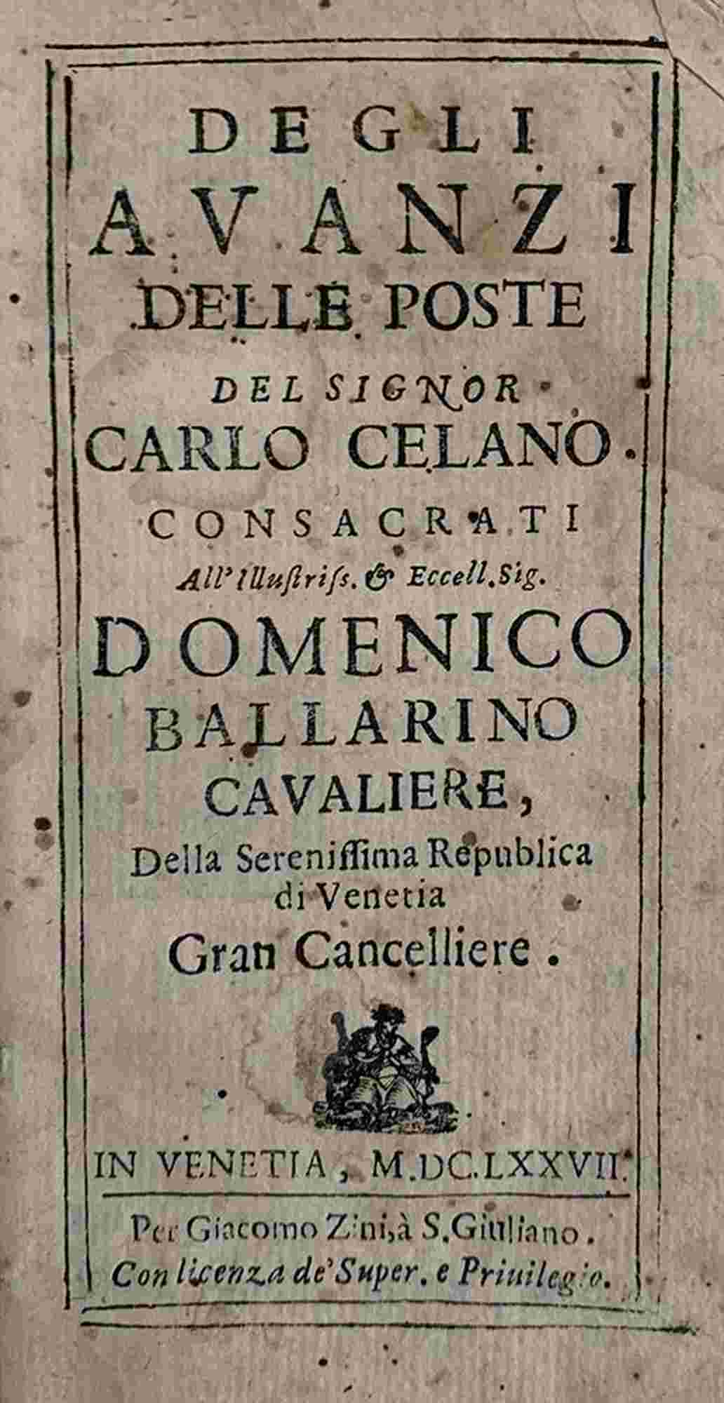 CARLO CELANO: Degli Avanzi Delle Poste, Venezia, Giacomo Zinia, 1678