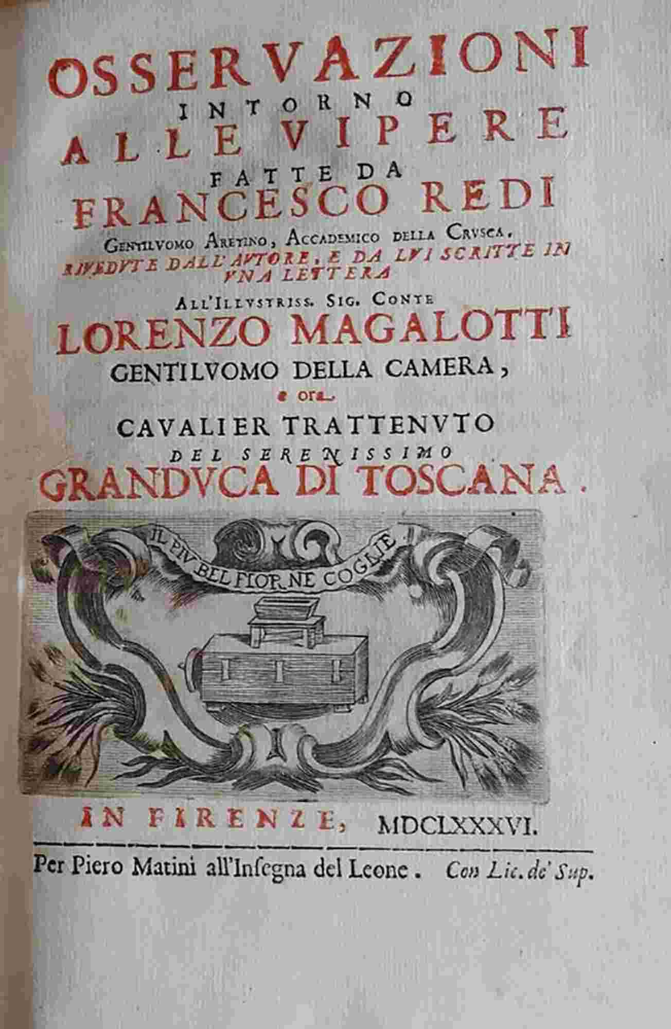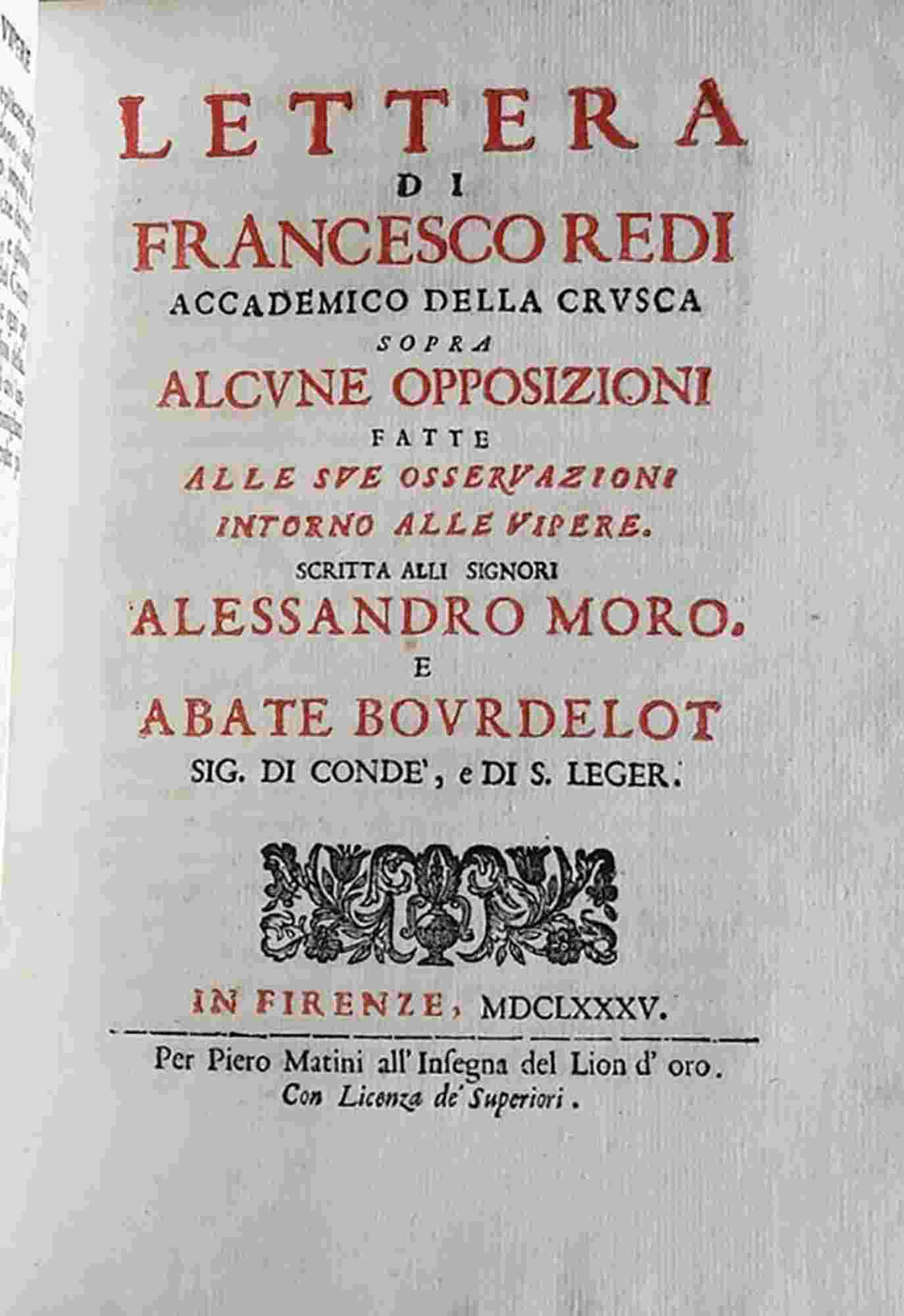 Osservazioni intorno alle vipere fatte da Francesco Redi Gentiluomo Aretino, Accademico della Crusca, rivedute dall’autore, e da lui scritte in una lettera all’Illustr. Sig. Conte Lorenzo Magalotti Gentiluomo della Camera e ora Cavalier Trattenuto del Serenissimo Granduca di Toscana. Firenze, per Piero Matini all’Insegna del Leone, 1686. Bound with: The same Lettera di Francesco Redi accademico della Crusca sopra alcune opposizioni fatte alle sue osservazioni intorno alle vipere. In Firenze, Per Piero Matini, 1685