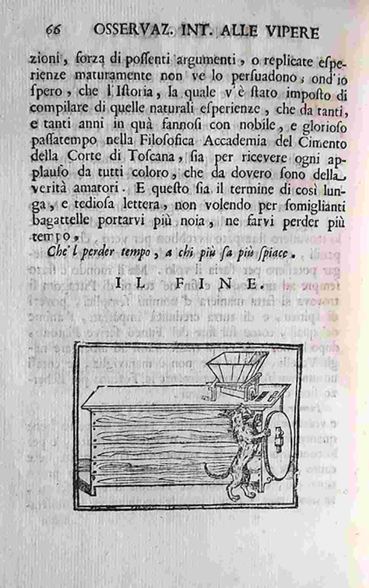 Originally published in 1664, these Observations on vipers are to be considered as one of the first work dealing with experimental toxicology..The experiments conducted on specimens of vipera aspis L. arrived from Naples in 1663 to the Ducal Pharmacy (superintended by Redi himself), showed that the poisoning resulted from the inoculation through the bloodstream of the stagnant liquid in the sheaths of the reptile teeth, while the poison was completely harmless if ingested. Moreover the beliefs about the therapeutic virtues traditionally attributed to the viper by-products used for the preparation of theriaca were denied.