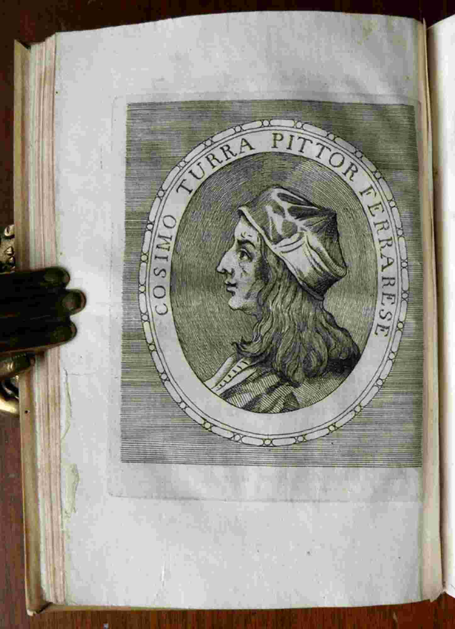 § 4 parts in 2 volumes, 8vo (12x18x3; 12x18x5 cm.); 1st vol.: title pge, 42, 197, [5] pp.(last 2 blanks); title page, vi, 246 pp. Signature: []1, A-O1-8, P1-10 (P10 blank); A-P1-8, Q1-4. 2nd vol.: title page, vi, 326, [2] pp.; title page, iv, 344, [4] pp., signature: []1, A-Y1-8, X1-7; A-Y1-8. Title pages within ornamental woodcut frame, signed Luigi Ughi, 25 engraved portrait of Ferrarese painters. Contemporary vellum, gilt title piece on spines. Title piece of the 1st volume missing, of the second one frayed. Quire N1-8 of the first part misbound after O8. Small stain on white lower margin of leaf D1 of the first part. Fine copy.