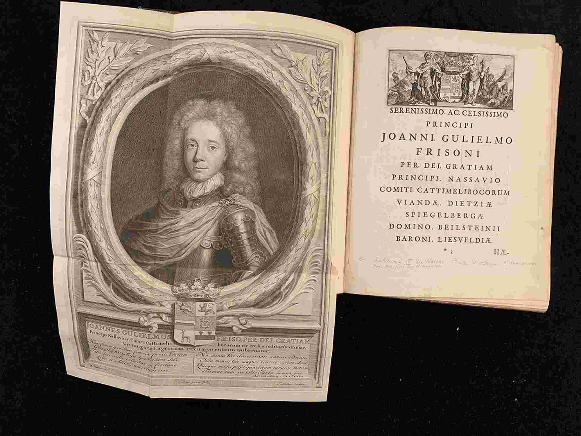 Allegorical frontispiece, frontispiece in red and black with central vignette. Intaglio portrait of the dedicatee of the edition, John William the Frisian, engraved by Gunst from an invention by Vaillant and folded f.t.