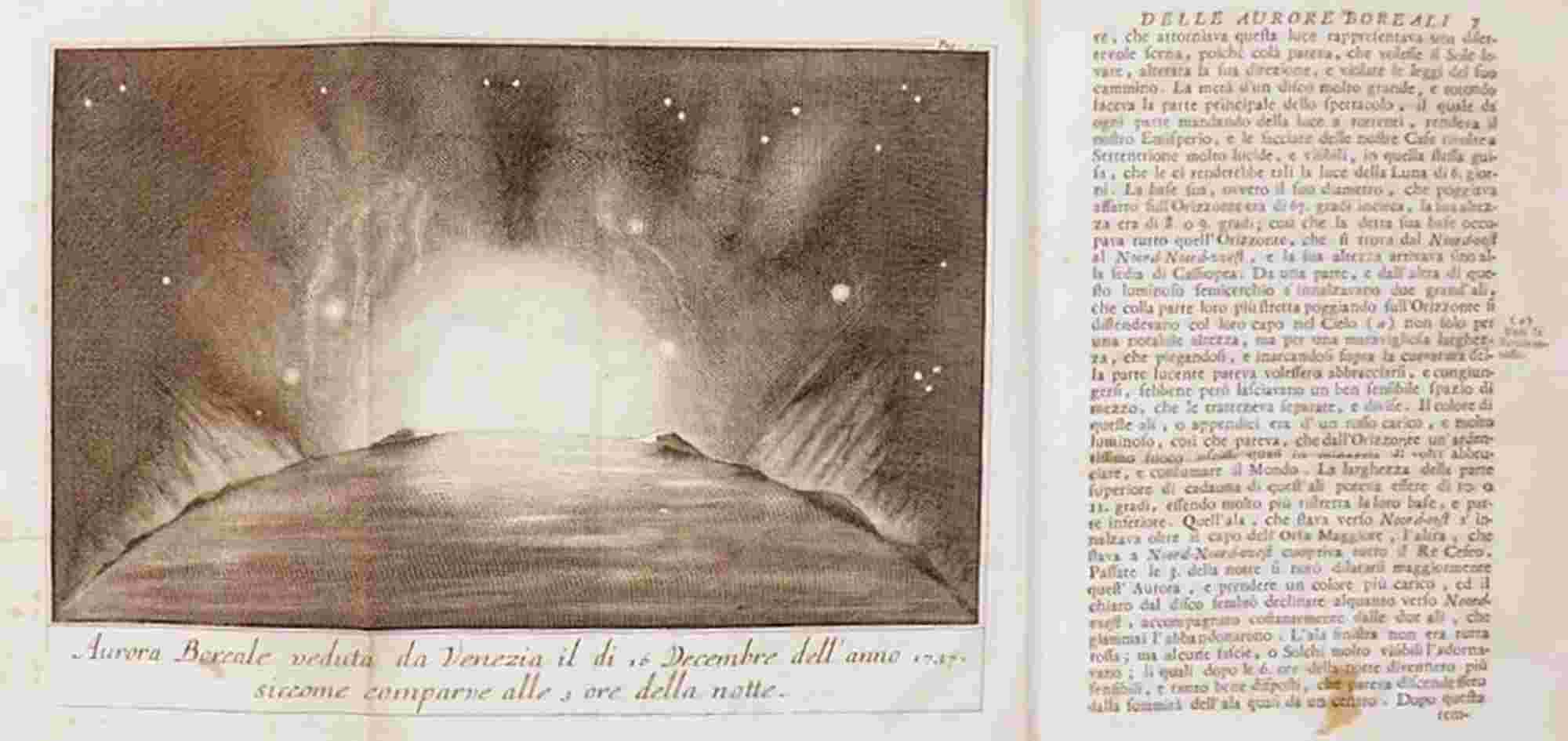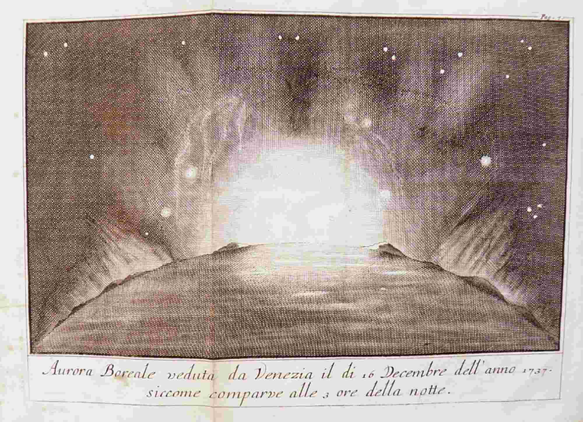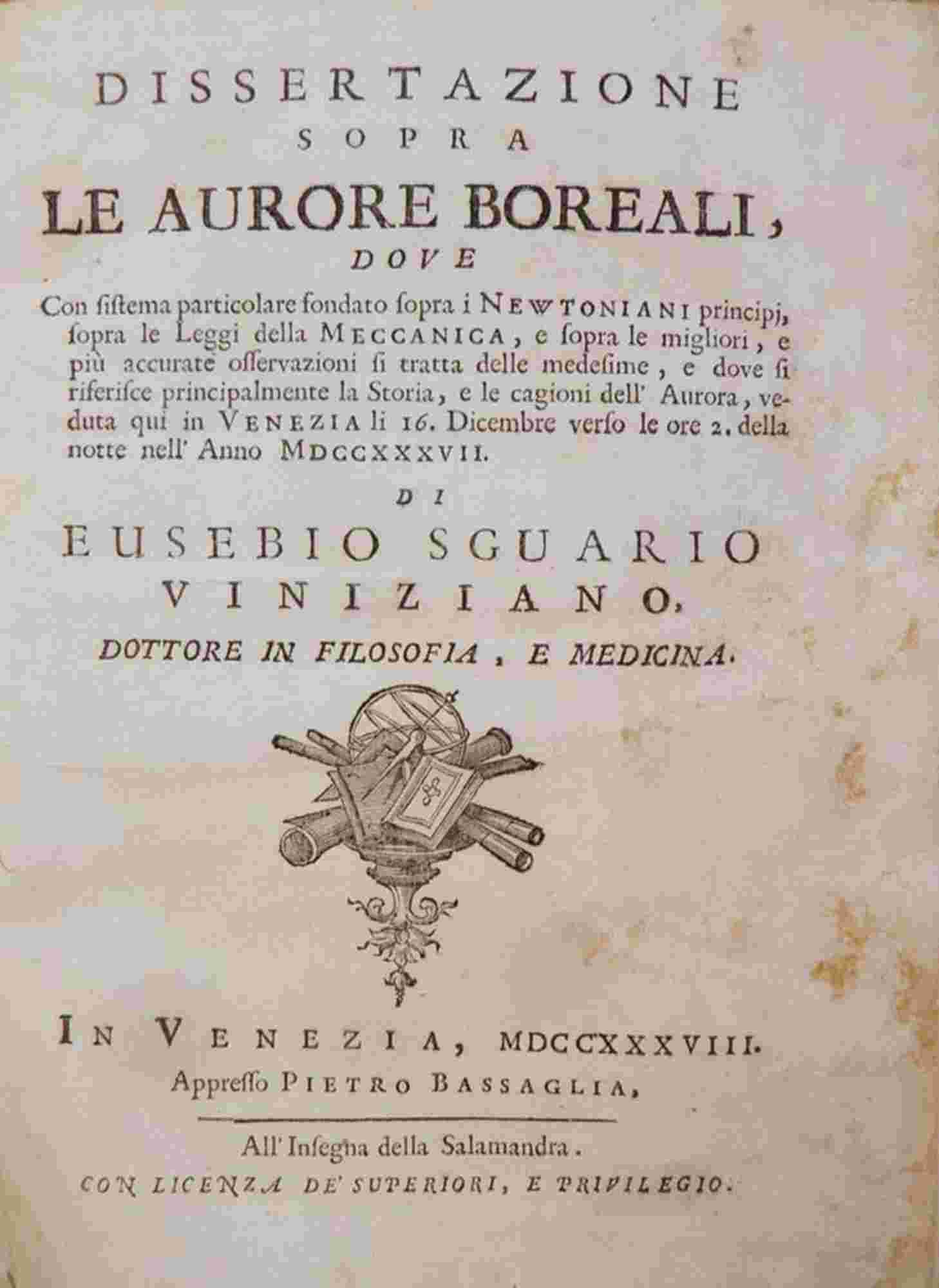 Only edition. Eusebio Sguario or Squario was a medical doctor who practised physics as a hobby; he is generally acknowledged as the first Italian author to write about electricity. This work, the first he wrote, was later followed by a book on electricity applied to medicine , by another about earthquakes and others of purely medical subject. The occasion for this work was the aurora borealis which was observed in Venice in the last days of 1737, a very rare phenomenon at that latitudes. Sguario denies that the aurora borealis might be a phenomenon related to a kind of combustion and he considers instead its origin to be due to the refraction of the solar rays by a sort of corpuscles present in the athmosphere. He also explains the black halo found in the center of some aurorae boreales with the total absorption of light made by some of such corpuscle.; in this way, the scientist rejects the theories about the origin of the Northern Lights of some authors, both ancient and modern, A list of aurorae boreales at the end of the book improves the famous one published by D’Ortous de Mairan in his work of 1733. Ref : Ronalds, p. 473; Riccardi I (2), 455S