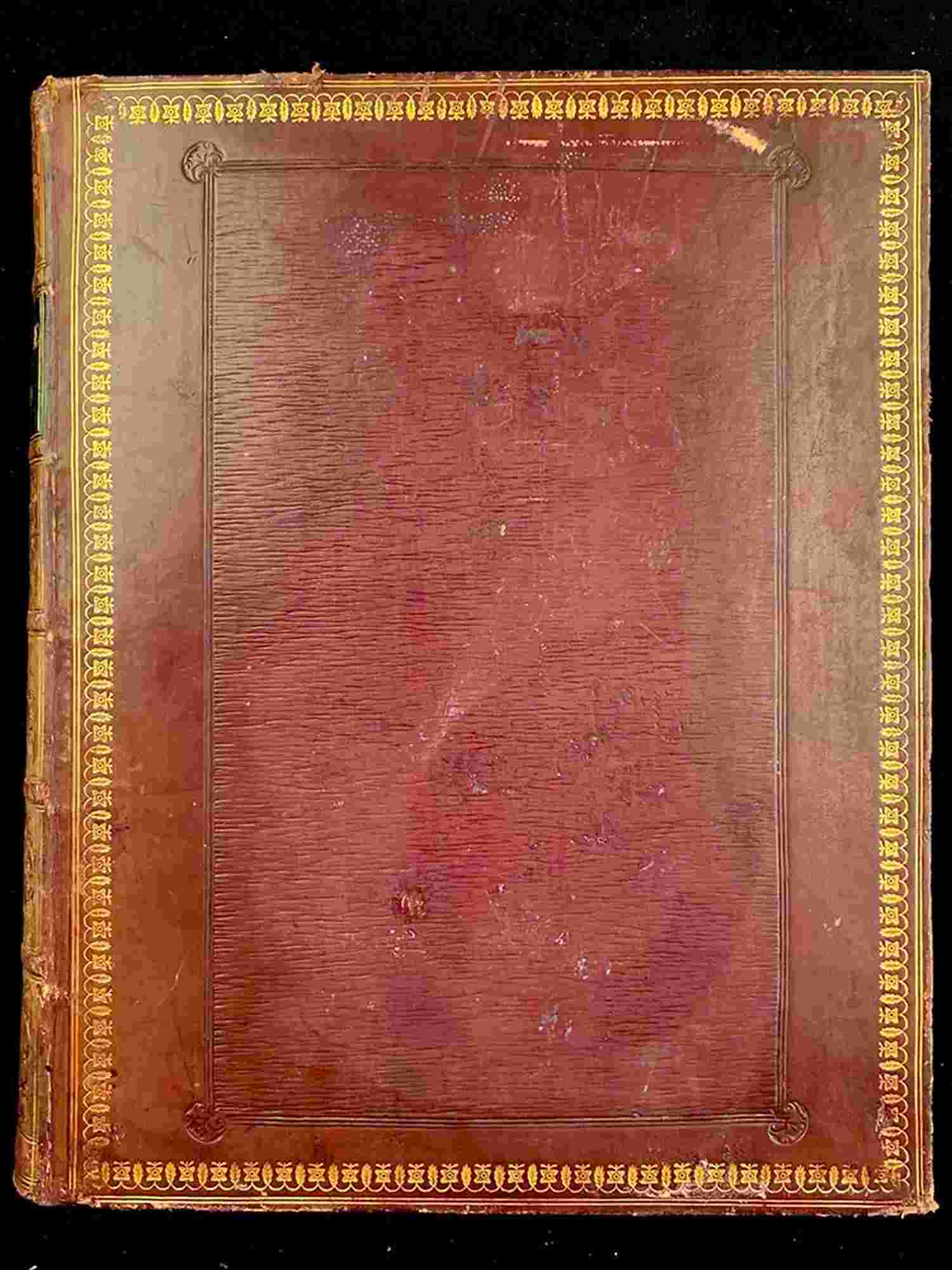 Back binding in full leather with gold decorations and marbled cuts.
