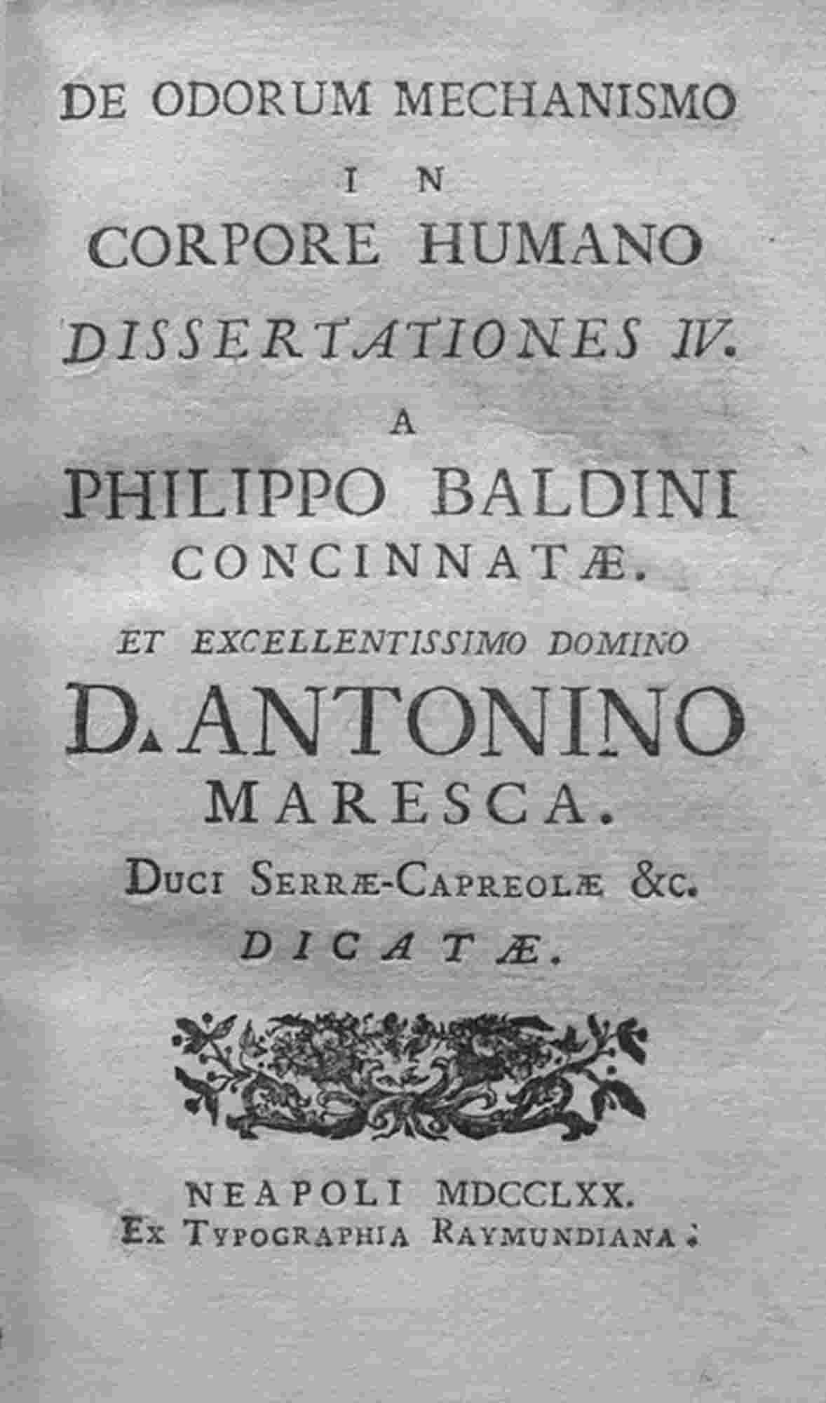 De odorum mechanismo in corpore humano dissertationes IV. a Philippo Baldini concinnatae. Et excellentissimo domino D. Antonino Maresca duci Serrae Capreole &c. dicatae. Neapoli, ex typographia Raymundiana, 1770