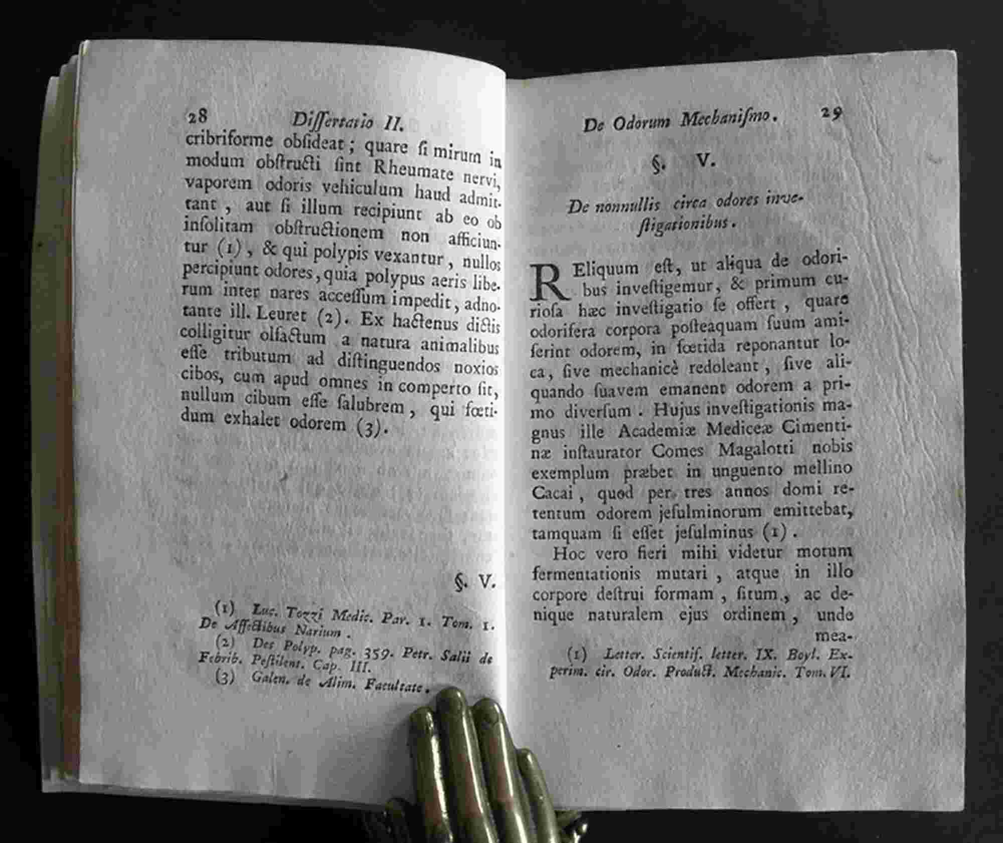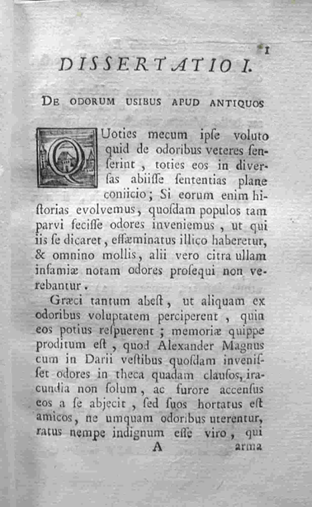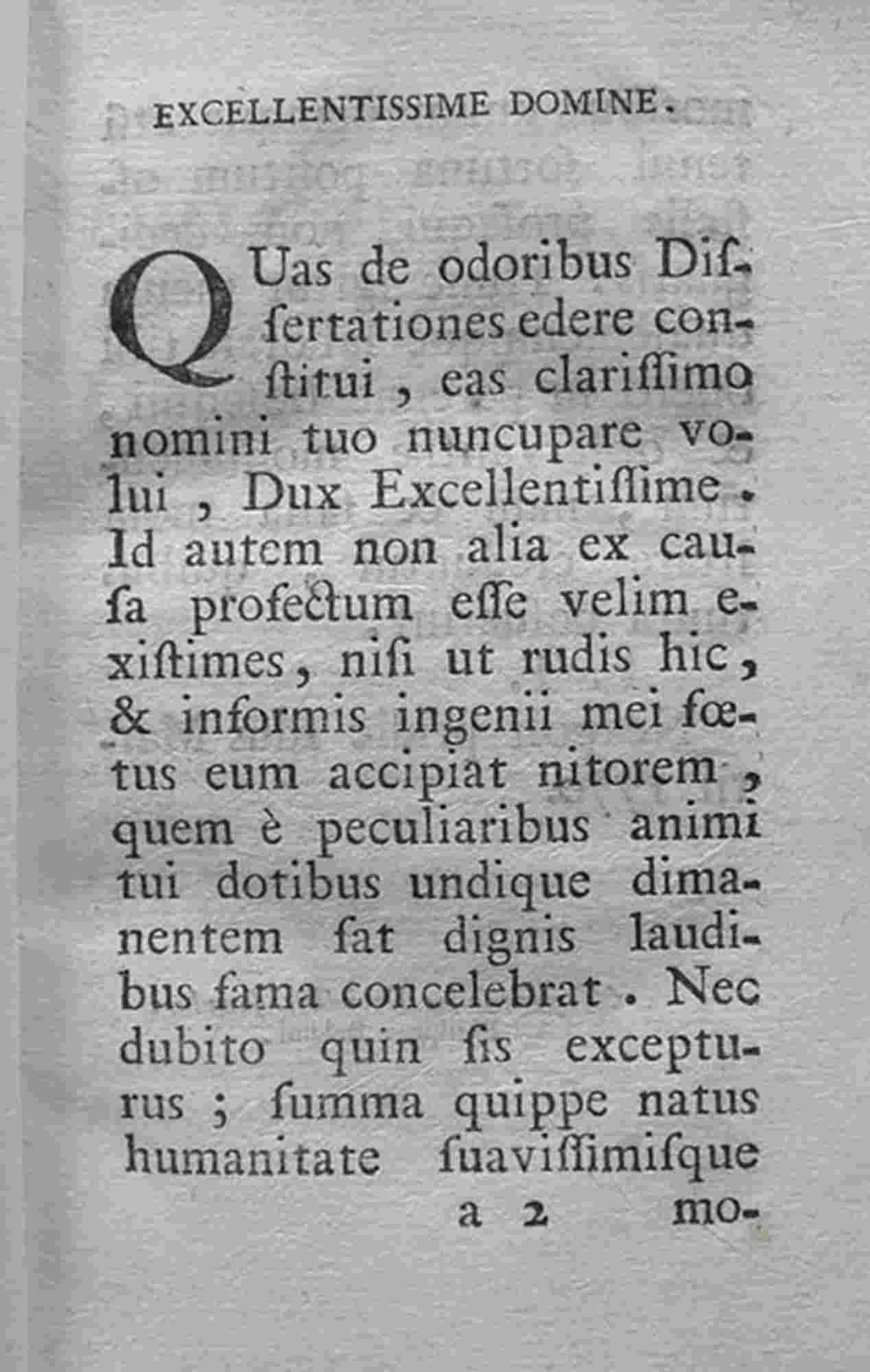 Exquisitely academic in their structure, the four dissertations that make up the work - allegedly constituting a reworking of Baldini’s graduation thesis -, after a brief historical excursus of the hypotheses concerning olfactory faculties, from the Epicurean theory of effluvia to speculations typical of Cartesian mechanicism, they focus on an accurate anatomical analysis of human olfaction, to which are added curious and innovative intuitions about the connection between mind and odours, not without avant-garde speculations about the existence of an olfactory memory.