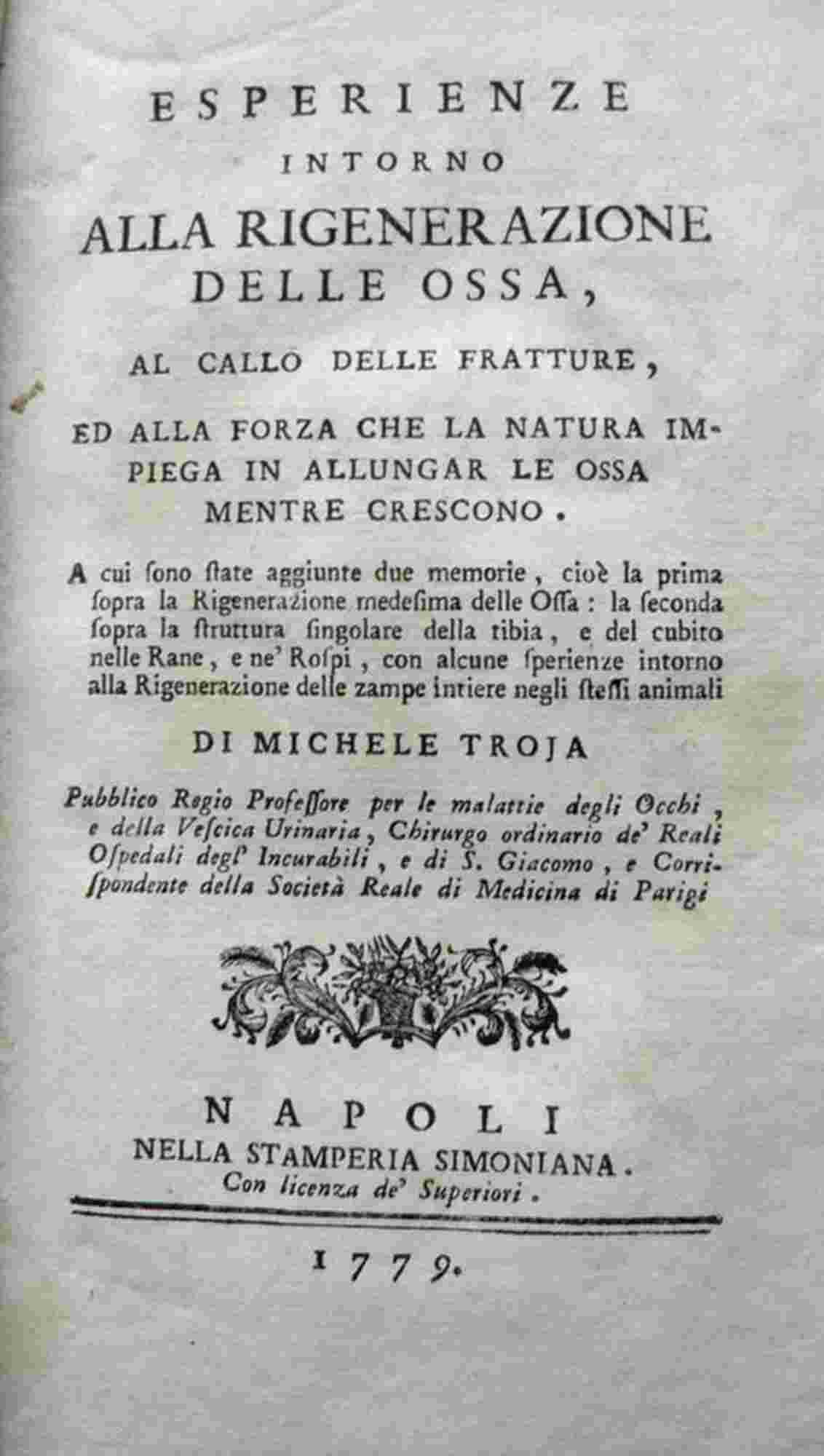 MICHELE TROJA (1747-1827): Esperienze intorno alla rigenerazione delle ossa, al callo delle fratture, ed alla forza che la natura impiega in allungar le ossa mentre crescono. ... Napoli, nella stamper