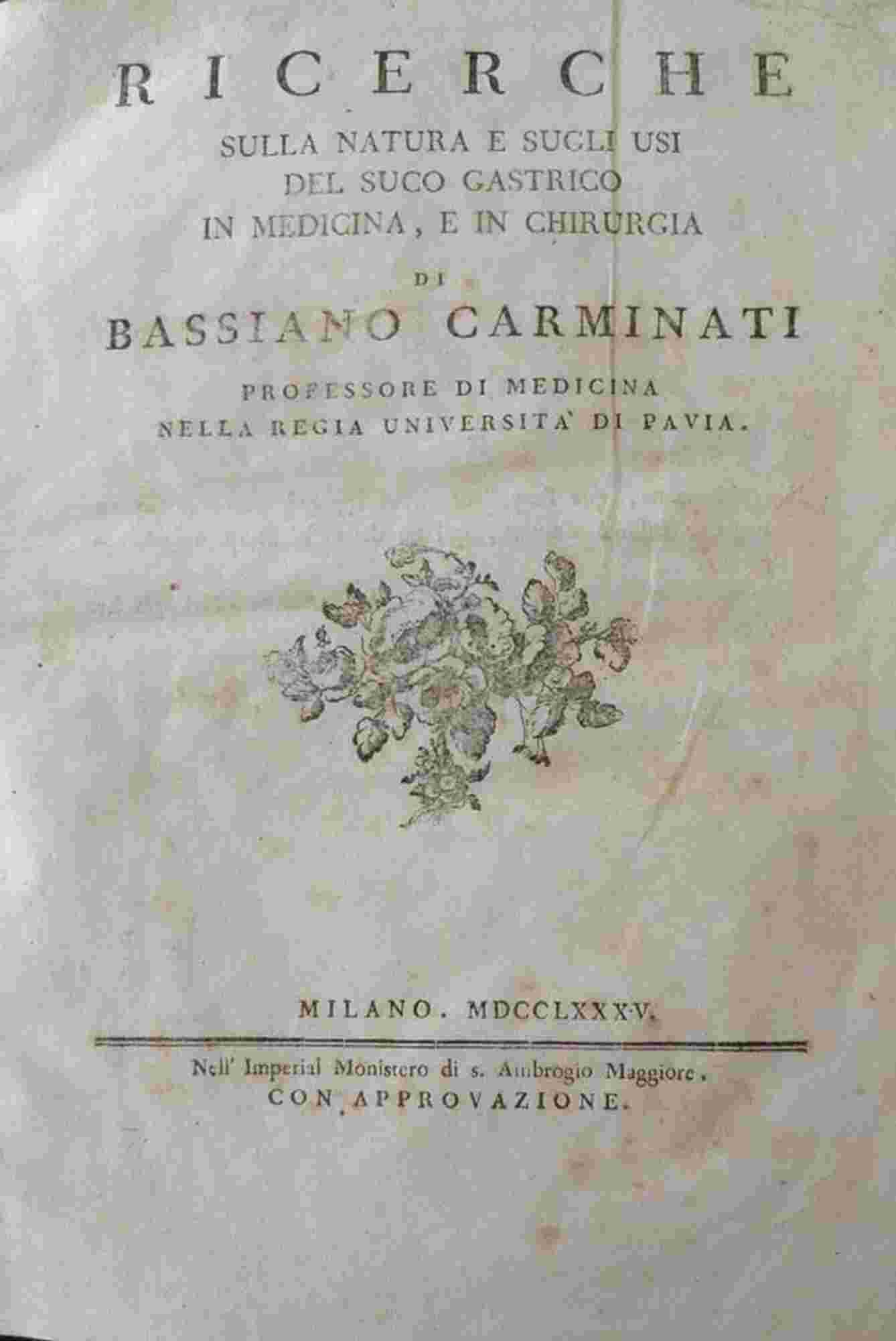 Ricerche sulla natura e sugli usi del suco gastrico in medicina, e in chirurgia di Bassiano Carminati professore di medicina nella regia università di Pavia Milano, nell’imperial monistero di s. Ambrogio Maggiore, 1785