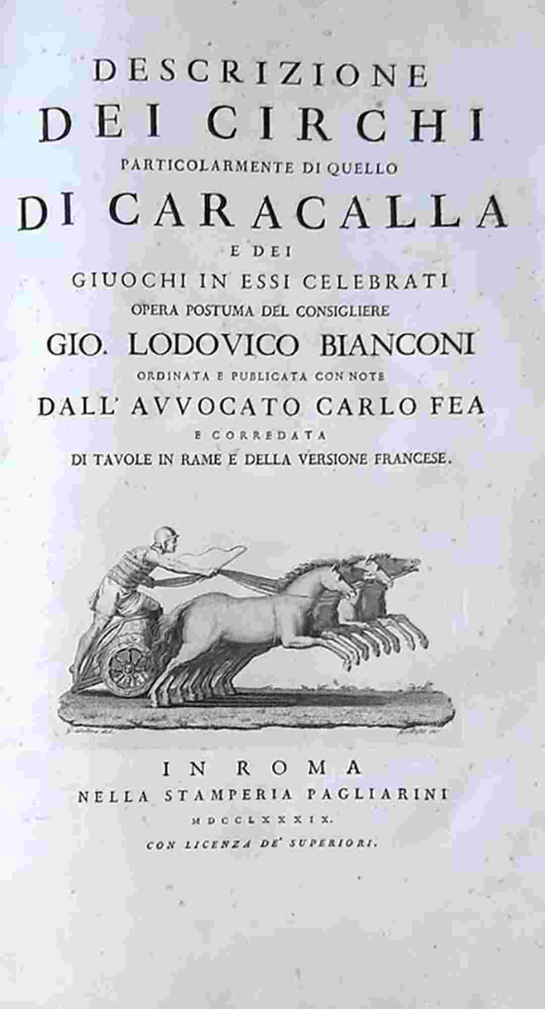 Descrizione dei circhi particolarmente di quello di Caracalla e dei giuochi in essi celebrati opera postuma del consigliere Gio. Lodovico Bianconi ordinata e pubblicata con note dall’avvocato Carlo Fea e corredata da tavole e dalla versione francese In Roma, nella stamperia Pagliarini, 1789.