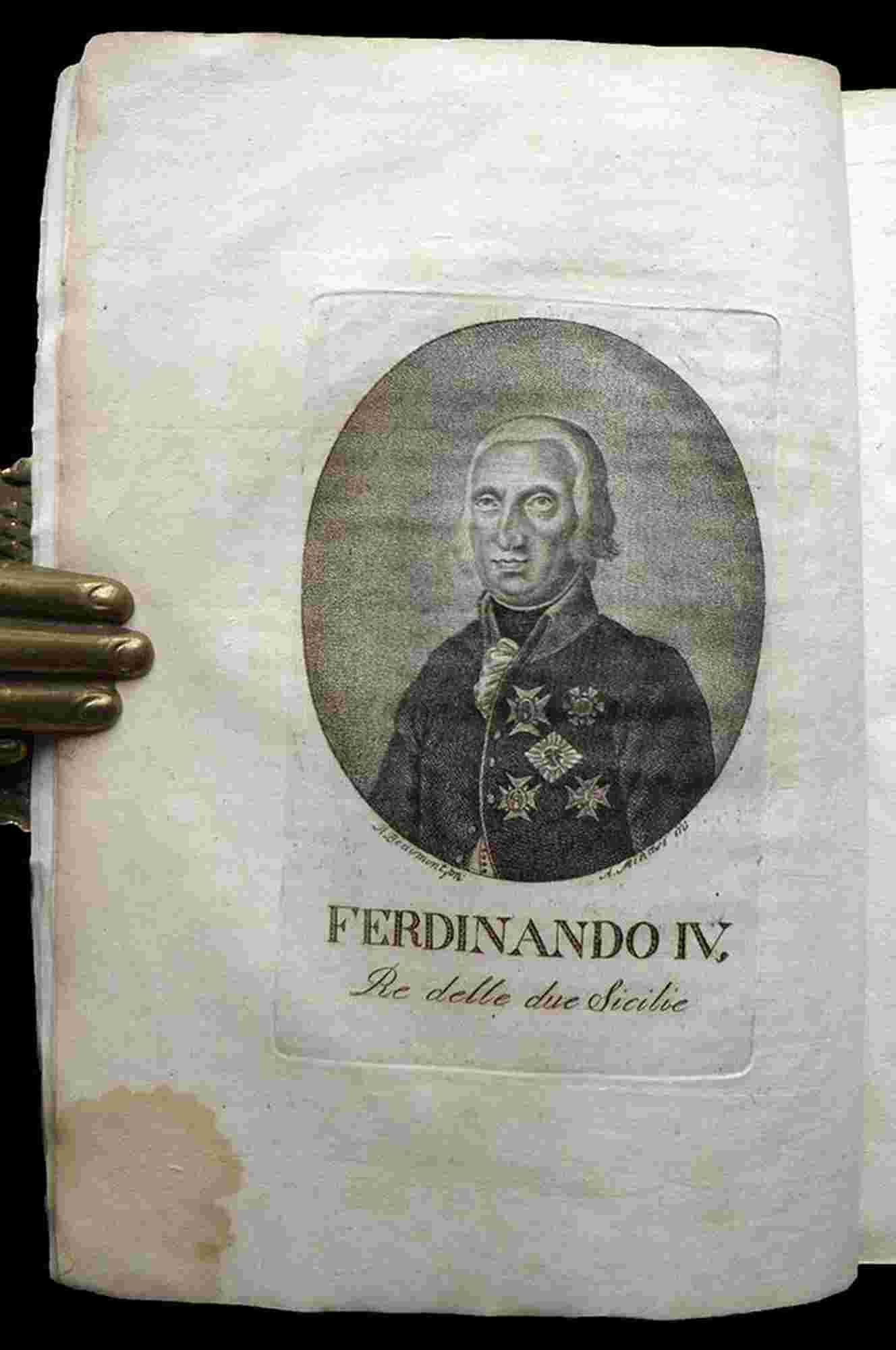 § 8vo (200 x 140), [14], IX, [3], 164 pp., signature A-M1-8; engraved frontispiece of Ferdinand IV, large folding engraved plate. Contemporary wrappers. Free leaf and first two leaves stain on right low corner, not affecting the text. Fine copy, crisp and wide-margined.