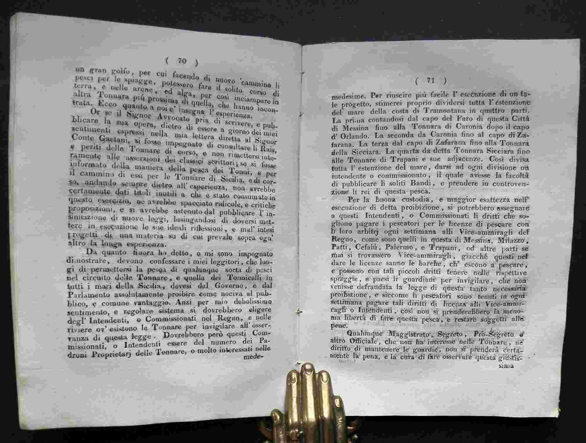 First edition of this work on tuna fisheries in Sicily; the author, Francesco Carlo d'Amico was count of Guido and duke of Calvello (previously Ossada), owned the tuna fisheries of San Giorgio. Written in response to a work published by Avolio, D ’Amico opposes and corrects many of Avolio's statements. Divided in three parts, the present works describes first about the tuna fish and explains different legal and fiscal aspects of the industry; the second part is about the distances among fisheries and the legal restictions on fishing on this basis; the third one is detailed description of the tuna fisheries in Sicily, their history, ownership, seasonal activity, harvest and so on.