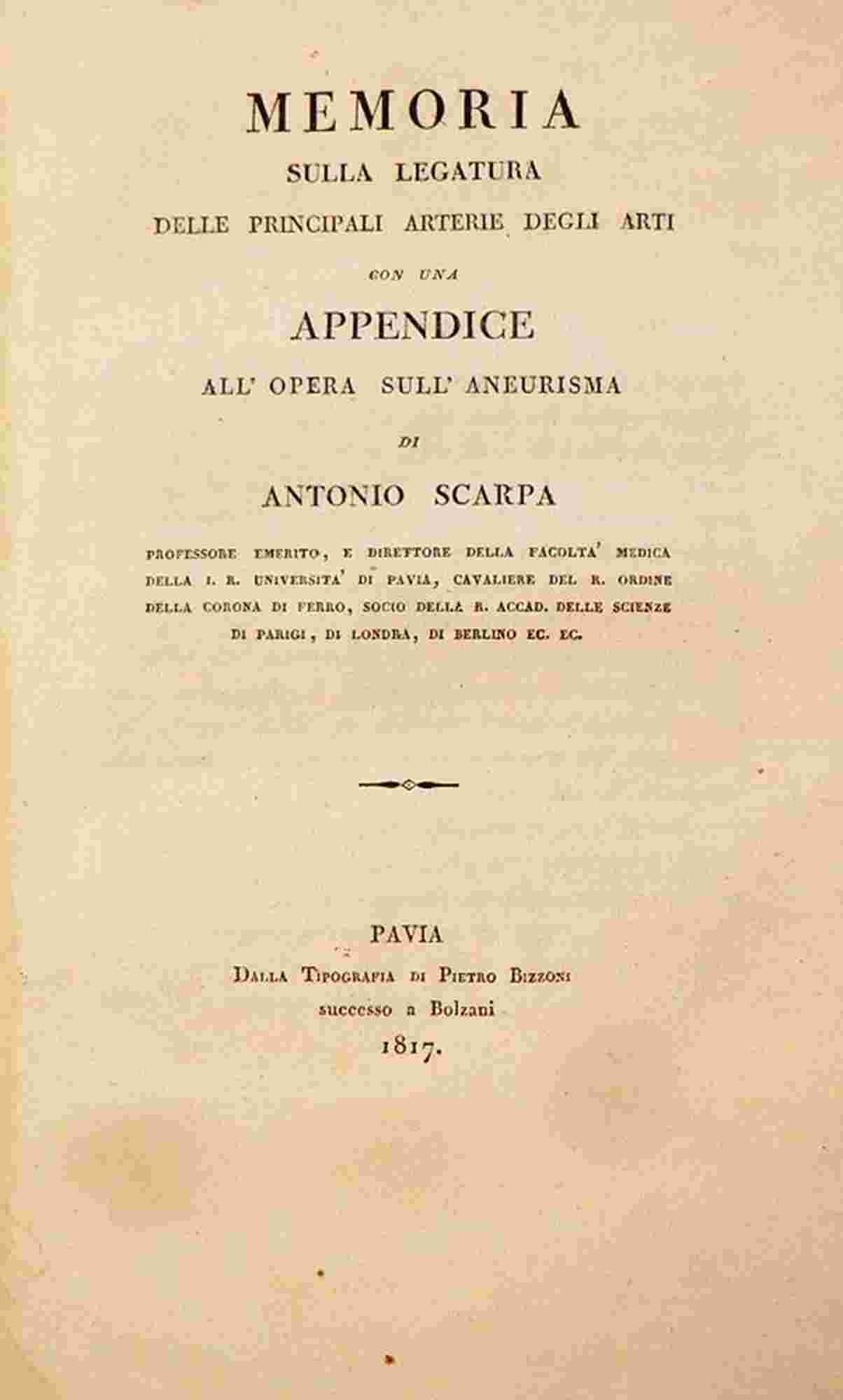 Memoria sulla legatura delle principali arterie degli arti con una appendice all’opera sull’aneurisma Pavia, Dalla tipografia di Pietro Bizzoni successo a Bolzani, 1817