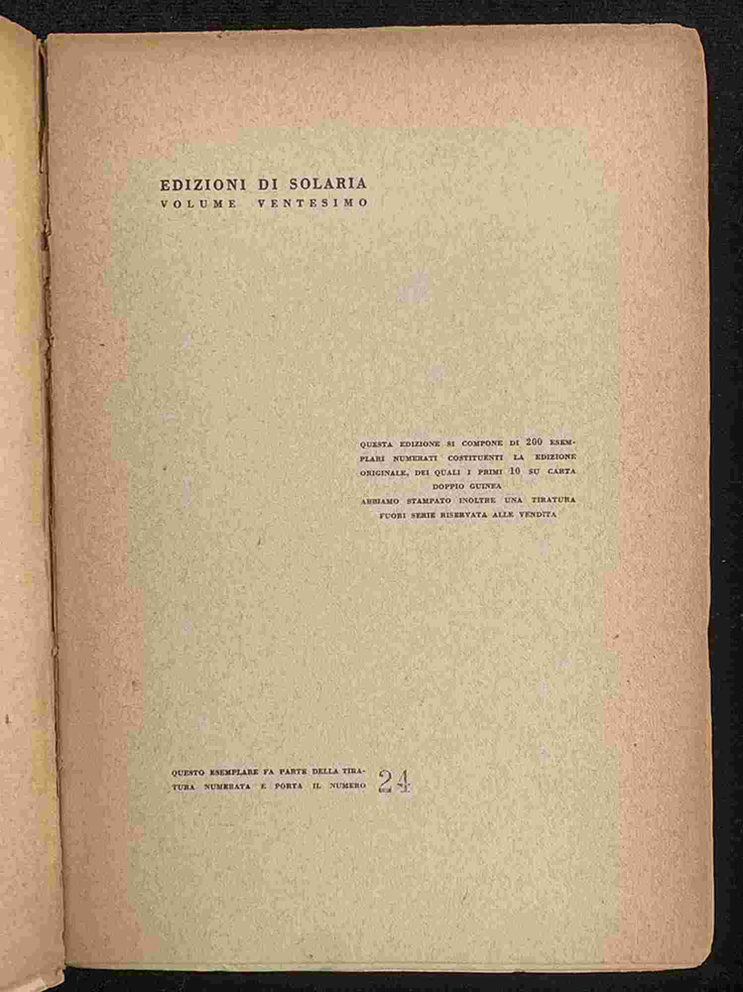 is now considered one of the greatest Italian storytellers of the twentieth century. As usual for the Editions of "Solaria", the book was printed in a numbered edition from 1 to 200 (the first ten copies on fine paper). Ours is the number 24 - "which constitutes the original edition" - as well as an unspecified print run out of series, reserved for sale" (which, however, in the case of Gaddi's debut we acknowledge is of eight hundred copies.