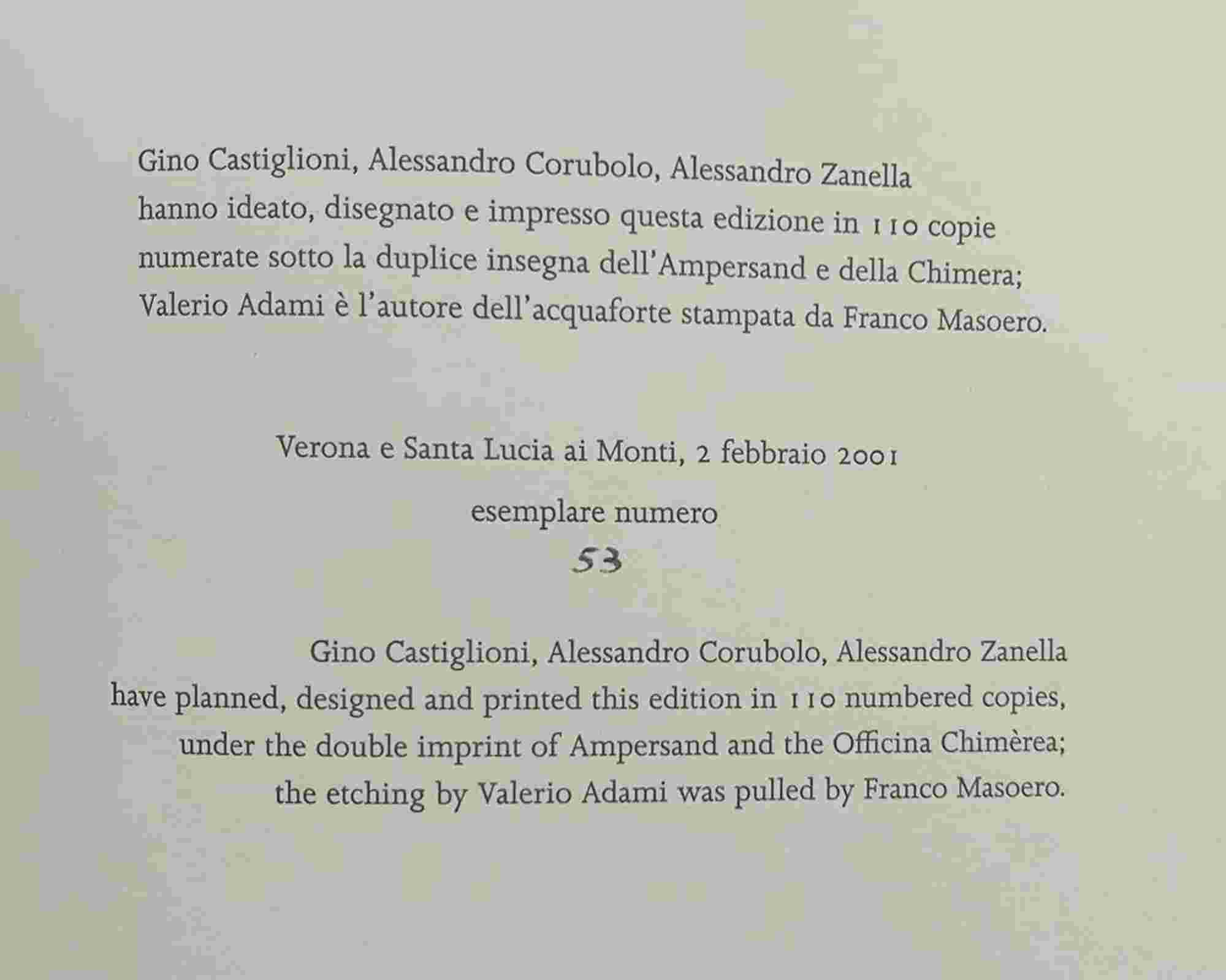 Edition printed in 110 numbered copies under the double insignia of Ampersand and Chimera.