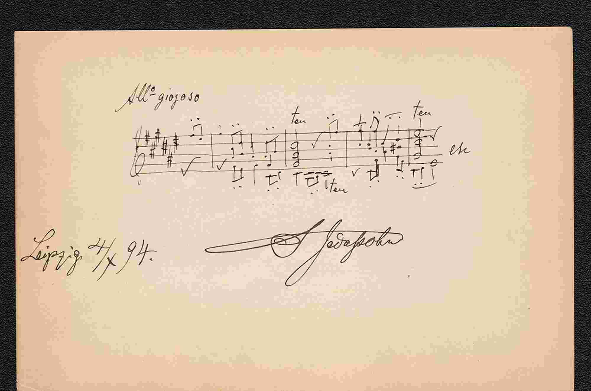 SALOMON JADASSOHN: Citazione musicale autografa firmata dal pianista tedesco, rinomato insegnante di pianoforte al Conservatorio di Lipsia, con data "Lipsia, 4/7/94". Una pagina (17,2 cm x 11,3 cm), i