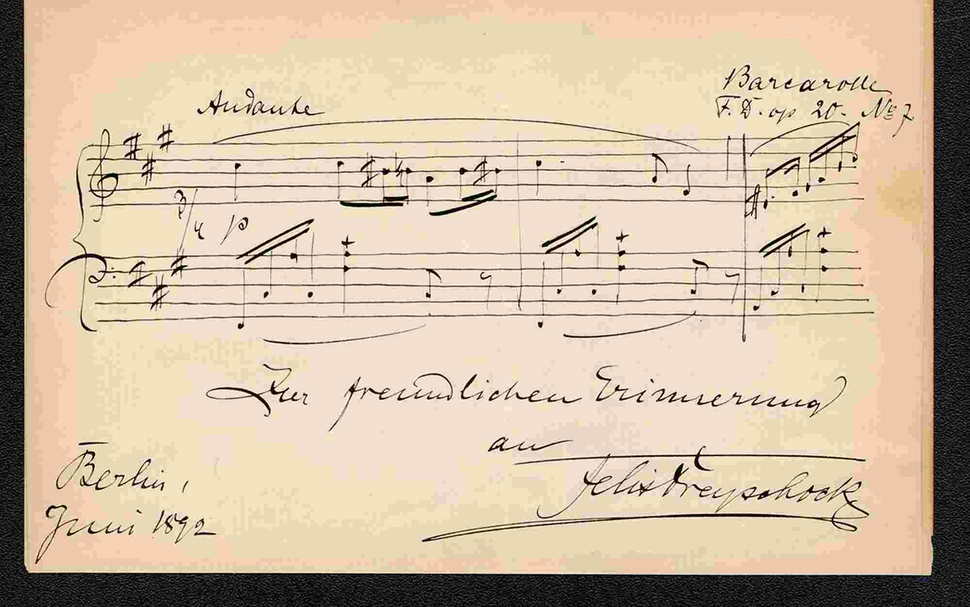 "Barcarolle op. 20 n. 7". Una pagina (17,2 cm x 11,5 cm) su cartone in tedesco, datata "Berlino, giugno
