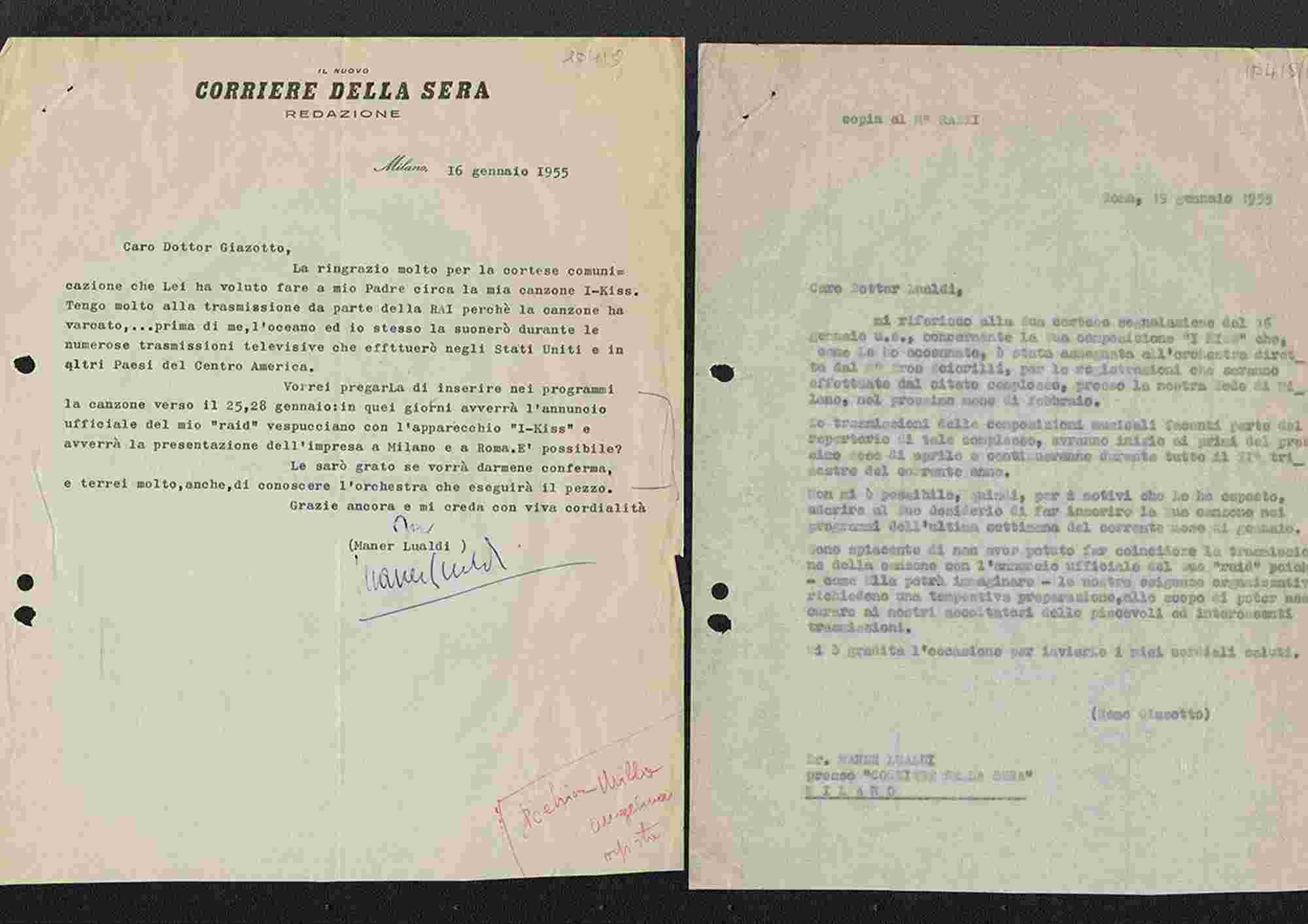 ADRIANO LUALDI: Tre lettere di cui due dattiloscritte, compongono un carteggio tra il compositore e il noto musicologo Remo Giazotto, datate tra il 1943 e il 1955. Ci si organizza per trasmissioni rad