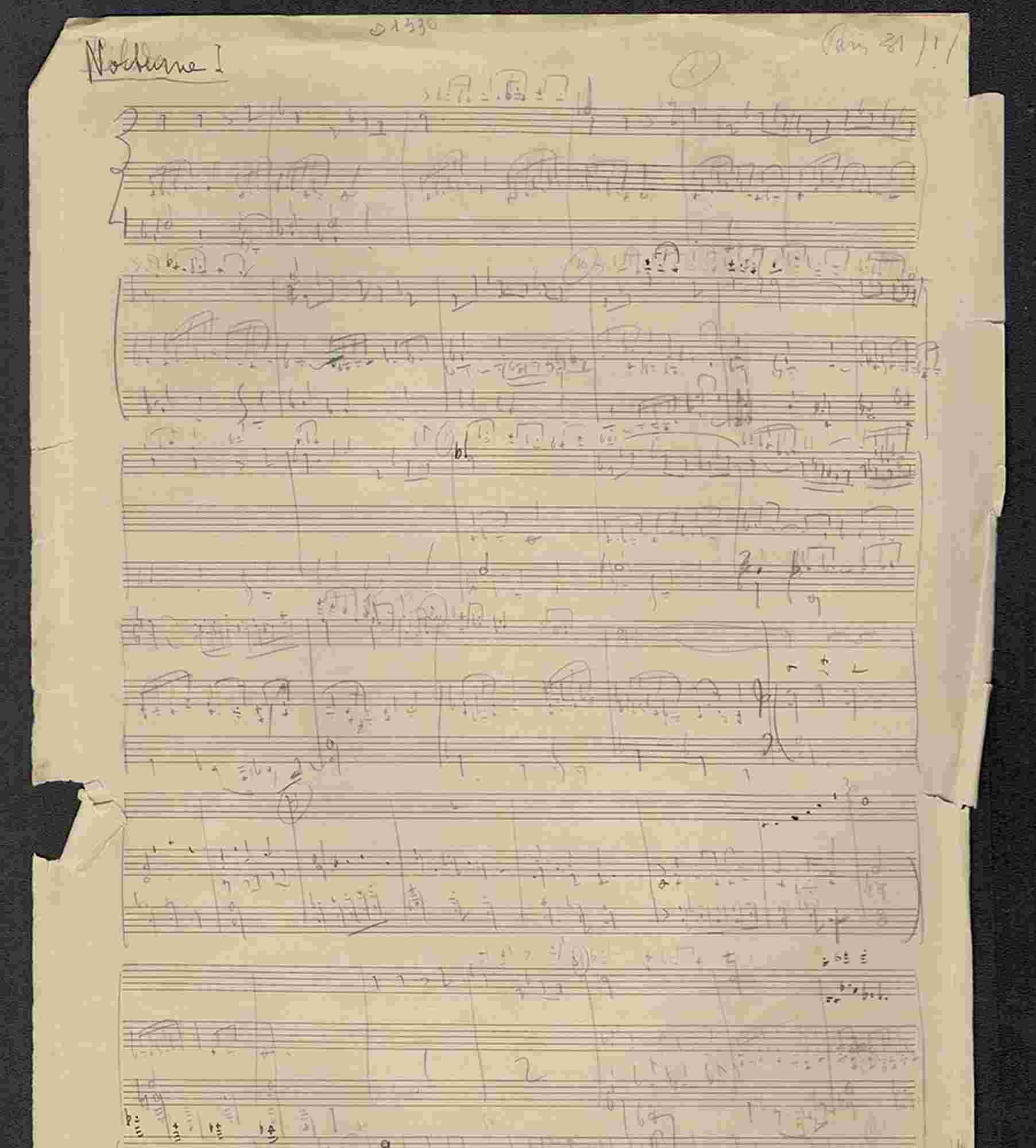Augustin De Piis e Paul Claudel - Nocturne I. Abbozzo autografo completo redatto su tre pentagrammi.