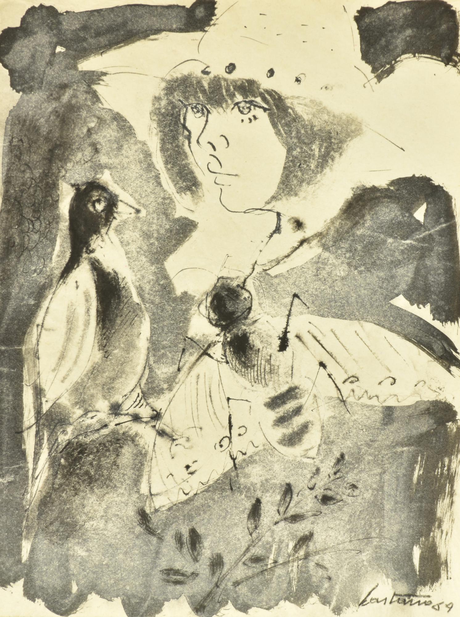 Aldo Castano DONNA CON ANIMALI china acquarellata su carta, cm 28x22 firma e...