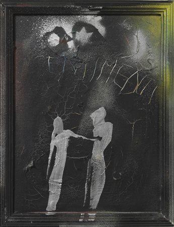 Tecnica mista su carta applicata su tela e cornice dipinta, cm. 26,5 x 20,5