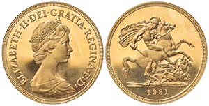 GRAN BRETAGNA. Elisabetta II. 5 Pounds 1981. Au (35.5mm, 40.00g). S. SE1; KM 924. qFDC