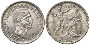 Vittorio Emanuele III (1900-1943). 20 Lire 1929 VII. Ar (35mm, 15.00g). Roma. Pagani 674; Gigante 38. Rarissima, 50 esemplari coniati. SPL