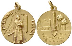 ITALIA. LIBIA. Medaglia Legione Libica, Generale Siciliani. D/Soldato della Milizia coloniale al centro, regge un fascio littorio di tipo imperiale, sullo sfondo, stilizzato, il profilo di un legionario romano, sulla d/ due palme. Intorno la scritta I ^ LEGIONE LIBICA. R/Paesaggio libico con rovine e palme. Al centro una vanga sovrapposta ad un fascio littorio di tipo imperiale, in basso uno spazio dedicatorio con la scritta AL GENERALE DOMENICO SICILIANI, in esergo la titolatura del metallo (K18). Manca in tutti i testi consultati. Au (27.5mm, 10.16g). SPL