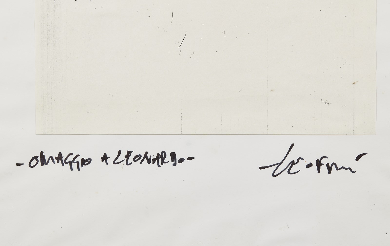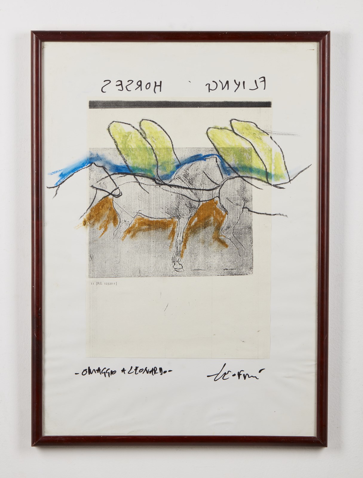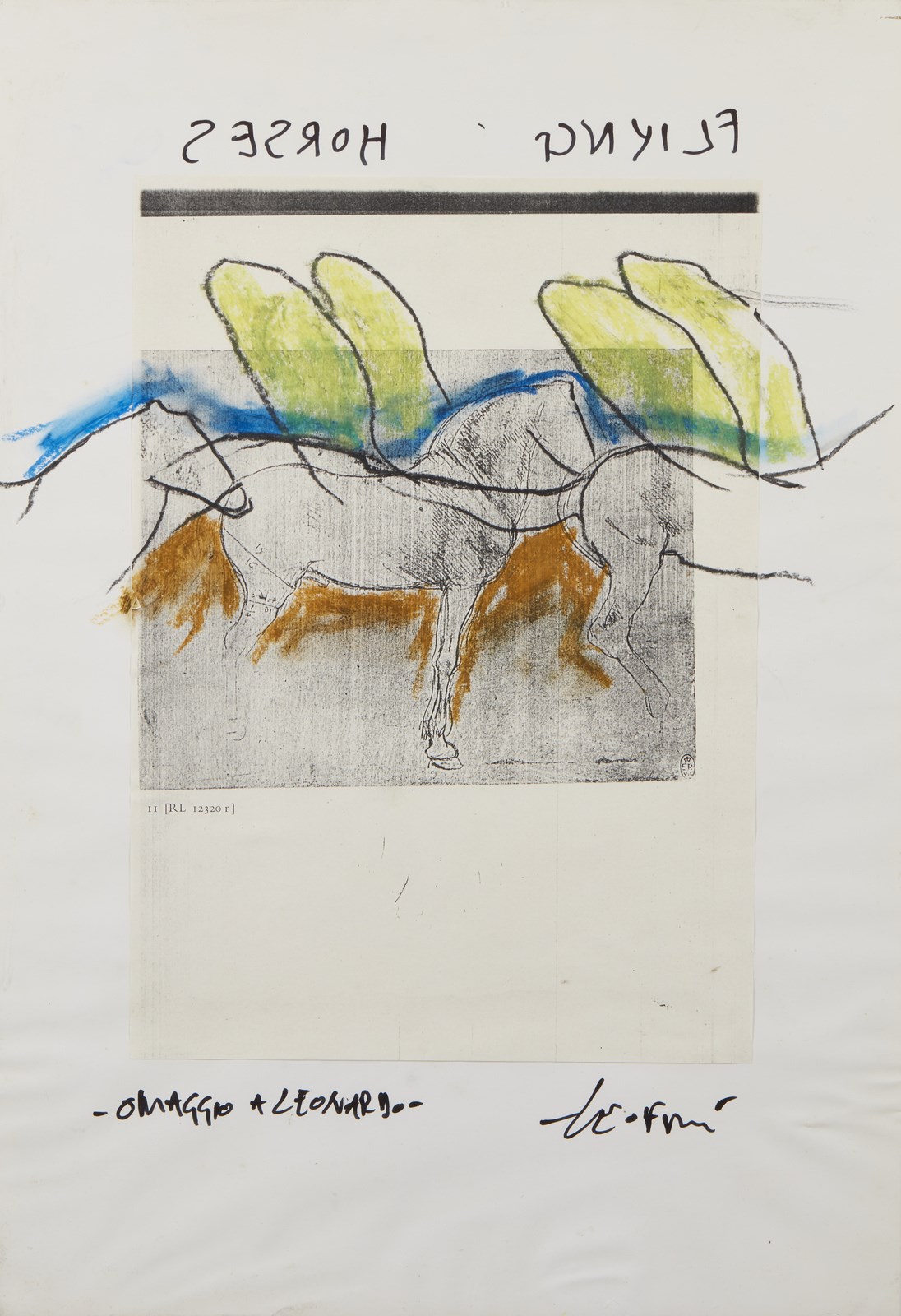 LEOFREDDI EMILIO (n. 1958) Omaggio a Leonardo (Fliyng Horses). Tecnica mista su carta. Cm 44,00 x 63,00. Firma e titolo in basso a pennarello. Difetti. . Cornice presente