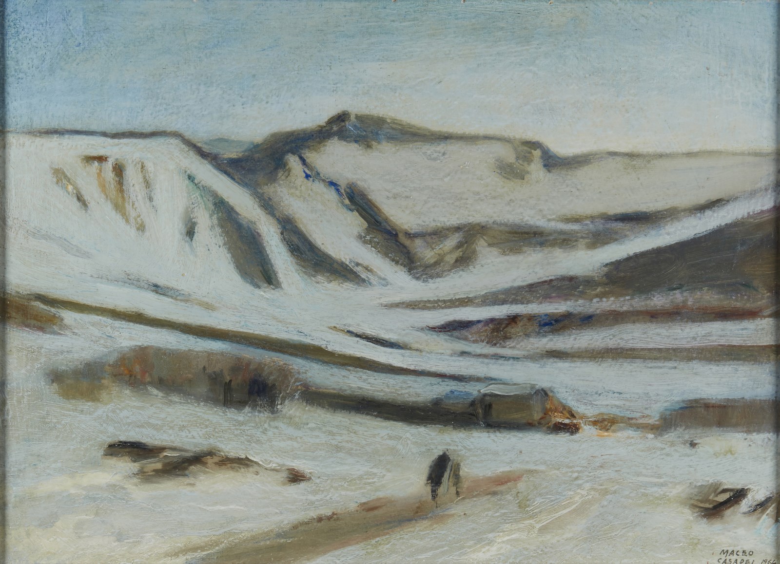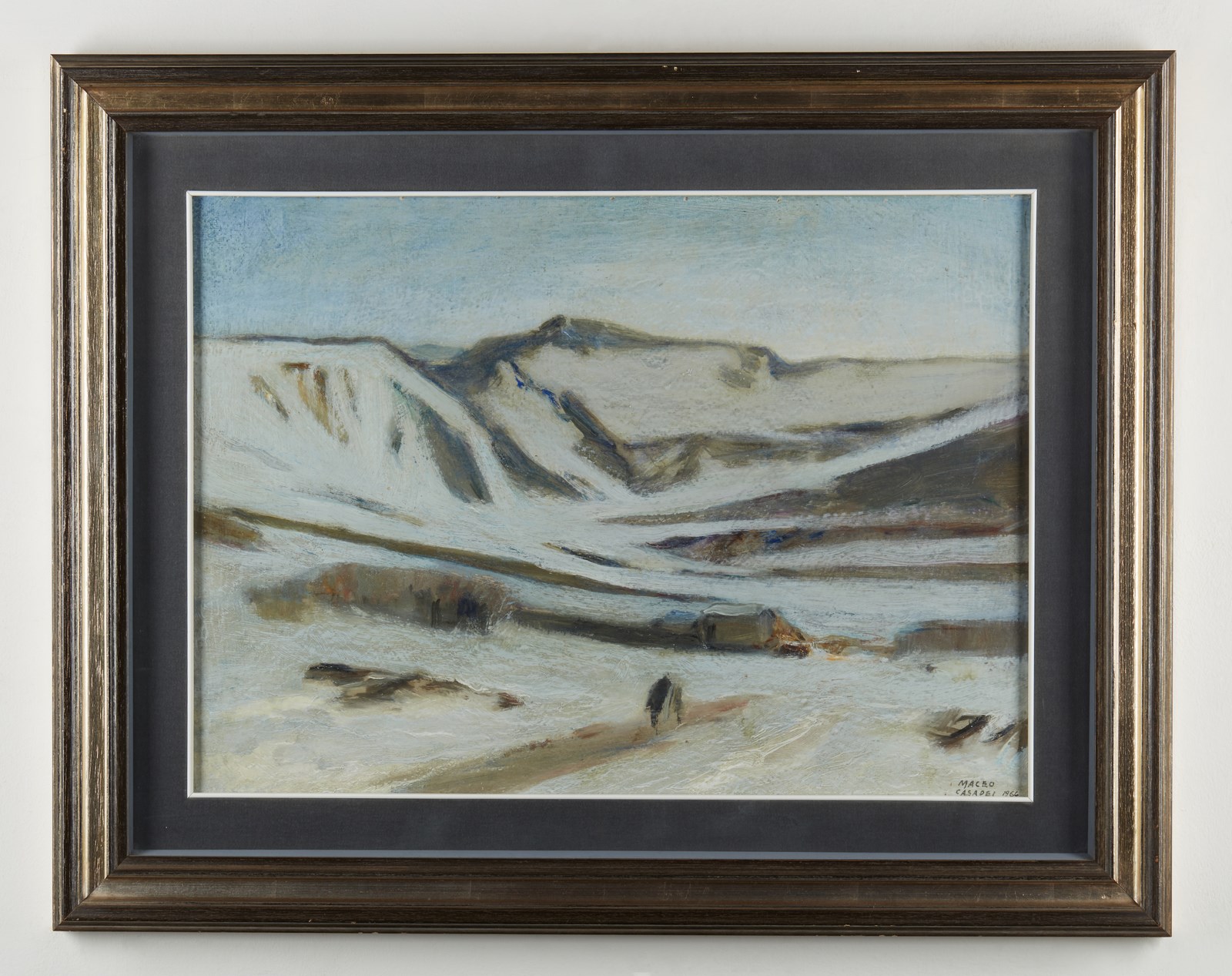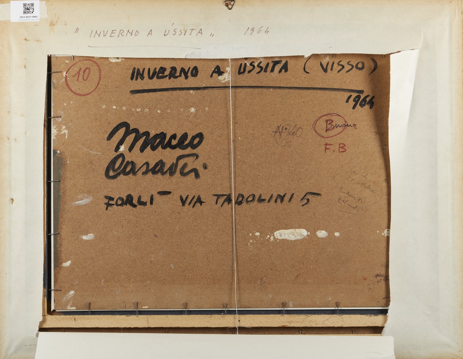 CASADEI MACEO (1899 - 1992) Inverno a Ussita (Visso). . 1964. Olio su tavola. Cm 65,00 x 47,00. Firma e anno in basso a destra. Al retro titolo, firma e anno. Lievi difetti. Cornice presente