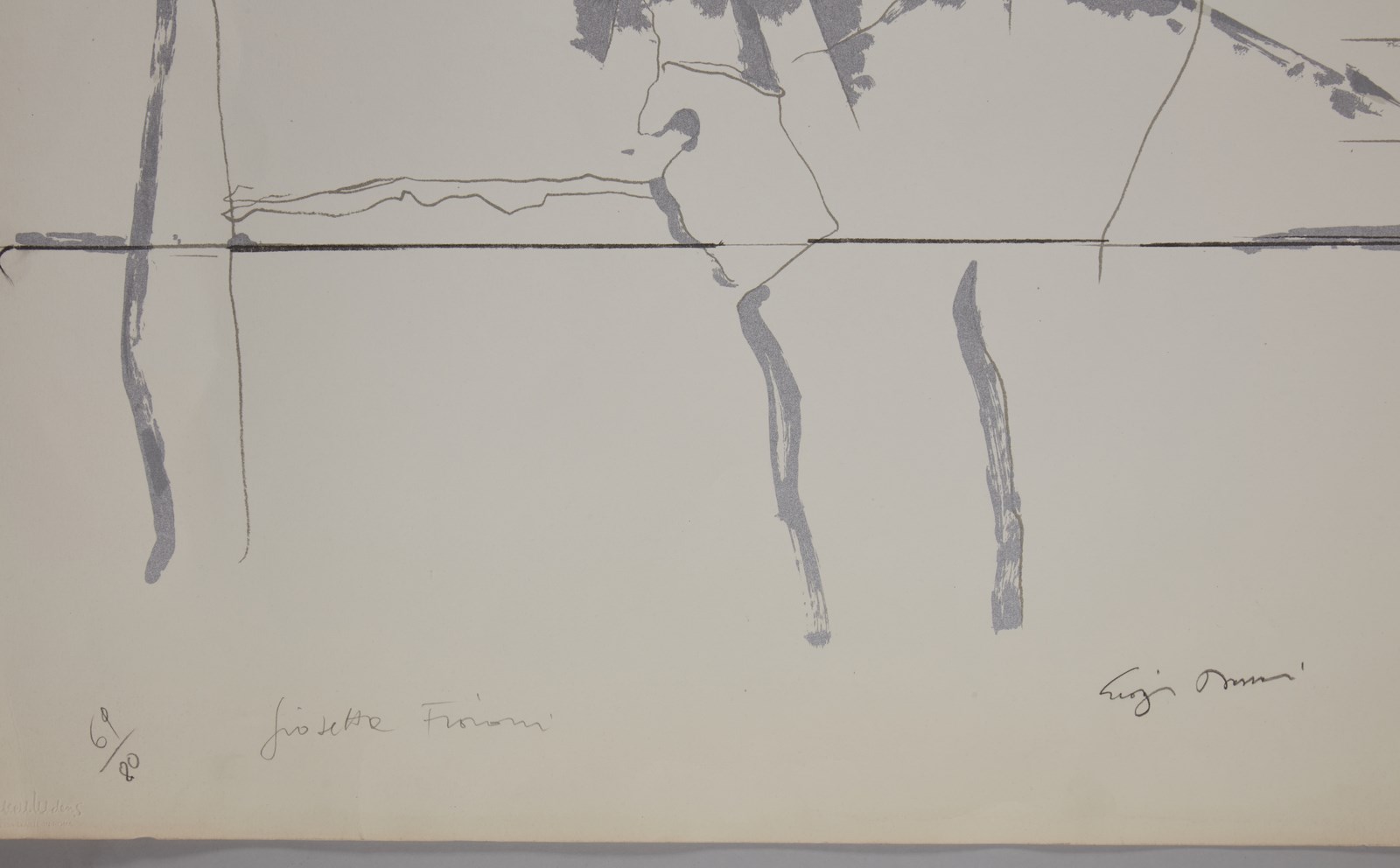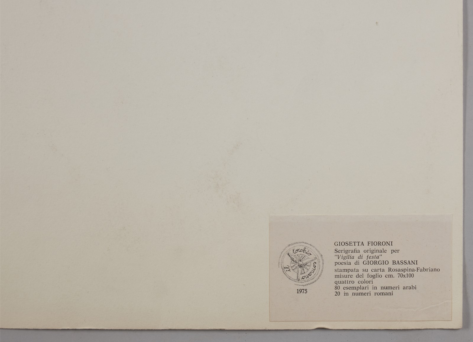 FIORONI GIOSETTA (n. 1932) Senza titolo. Serigrafia.. Cm 70,00 x 100,00. 69/80. Tiratura e firma in basso a sinistra a matita. In basso a destra firma a matita dello scrittore Giorgio Bassani. Carta Rosaspina-Fabriano. Edizione totale: 80 esemplari in numeri arabi e 20 in numeri romani. Lievi difetti.