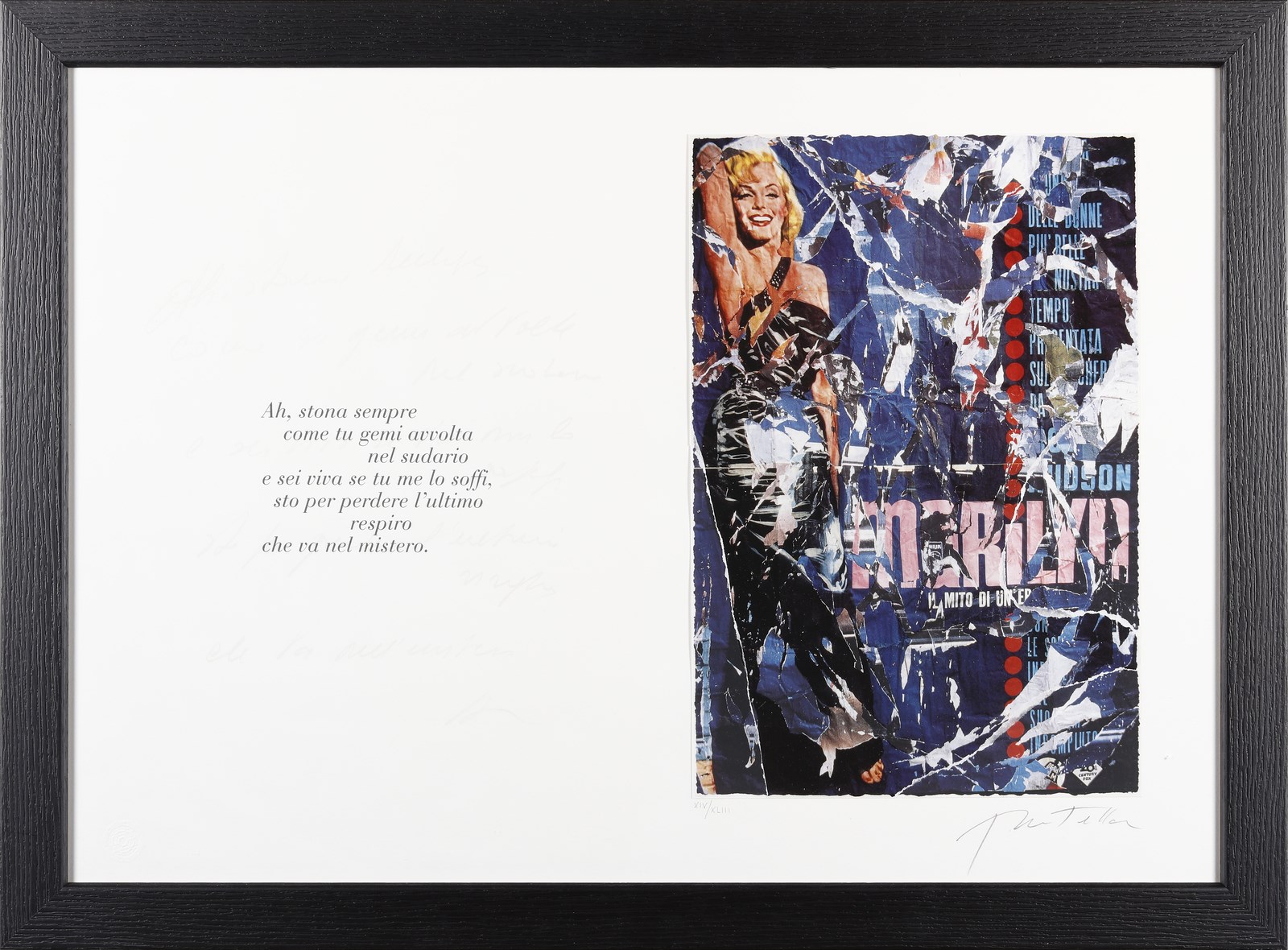 ROTELLA MIMMO (1918 - 2006) Marilyn, Bellezza eterna. 2005. Decollage. Cm 70,00 x 50,00. XIV/XLIII. Tiratura e firma in basso a matita.Grafica proveniente dal volume "Marilyn Bellezza eterna”, di Mimmo Rotella e Alda Merini. Ogni foglio è abbinato ad una poesia inedita di Alda Merini.