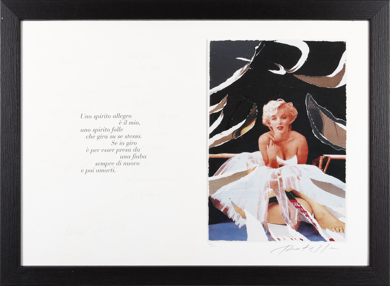 ROTELLA MIMMO (1918 - 2006) Marylin white. 2005. Decollage. Cm 70,00 x 50,00. XVI/XLIII. Tiratura e firma in basso a matita.Grafica proveniente dal volume "Marilyn Bellezza eterna”, di Mimmo Rotella e Alda Merini. Ogni foglio è abbinato ad una poesia inedita di Alda Merini.