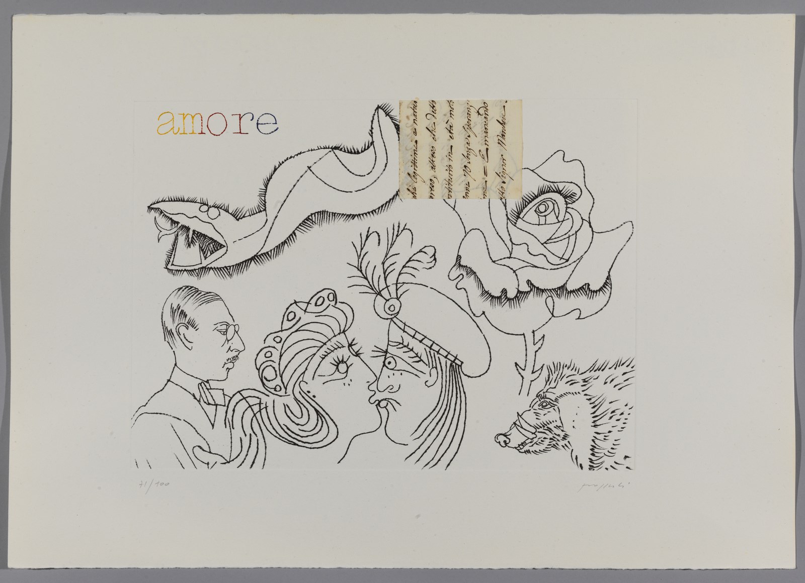 POZZATI CONCETTO (n. 1935) Lotto composto da n. 2 fogli. Per Amore, Amore. Acquaforte, acquatinta e collage. Cm 49,80 x 35,00. 71/100. Ogni foglio è firmato e numerato in basso a matita. Dimensione lastra 23,5x32 cm.