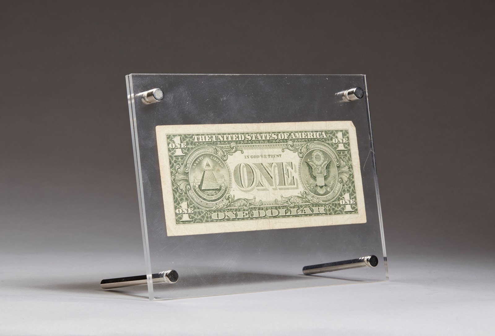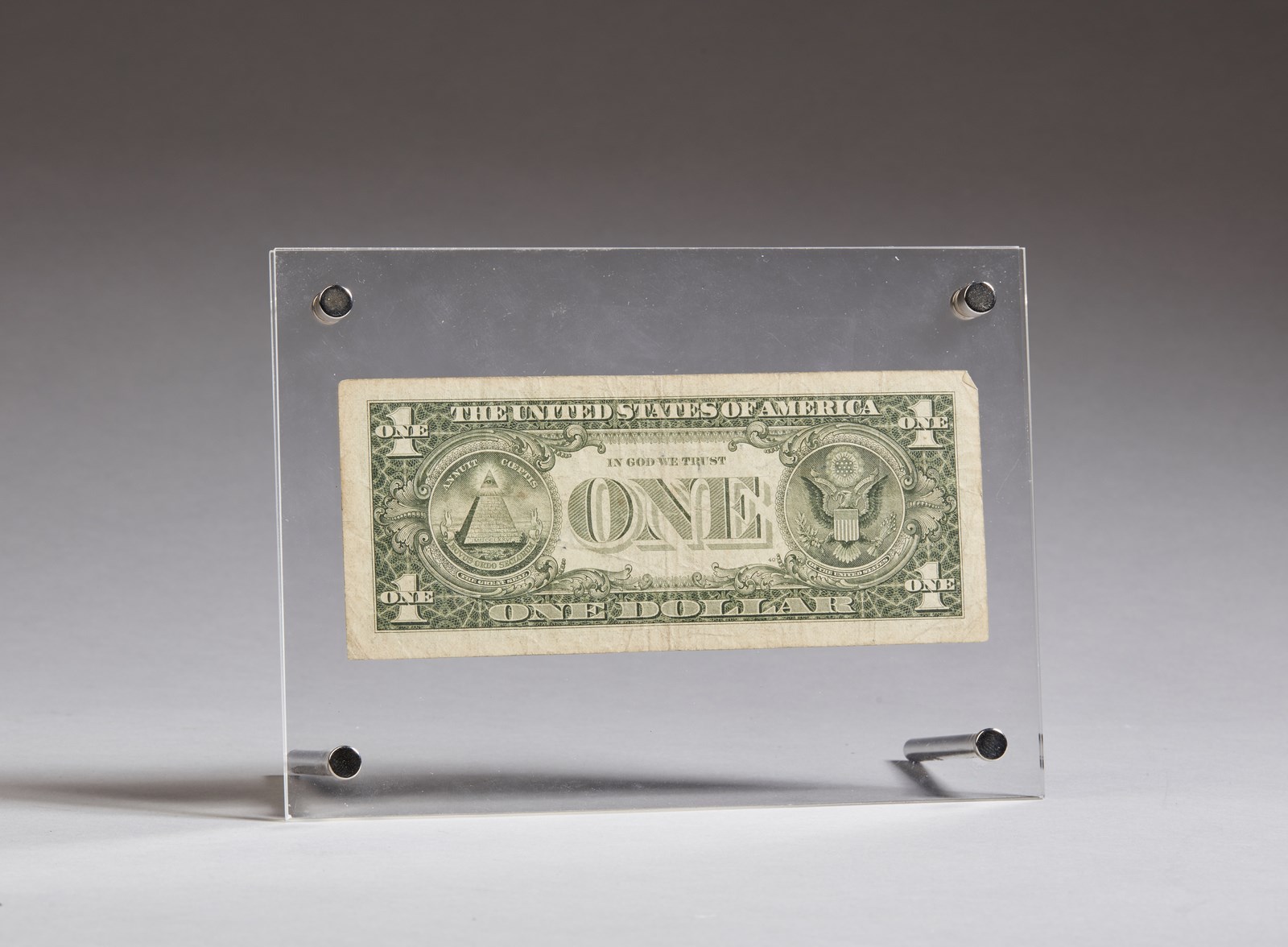 HARING KEITH (1958 - 1990) (ATT.TO) One dollar. 1988. Intervento su banconota. Cm 15,60 x 6,60. Disegno a pennarello nero firmato e datato su una banconota da un dollaro. Certificato di autenticità di Frank P. Garo, Cooperburg. . Cornice presente