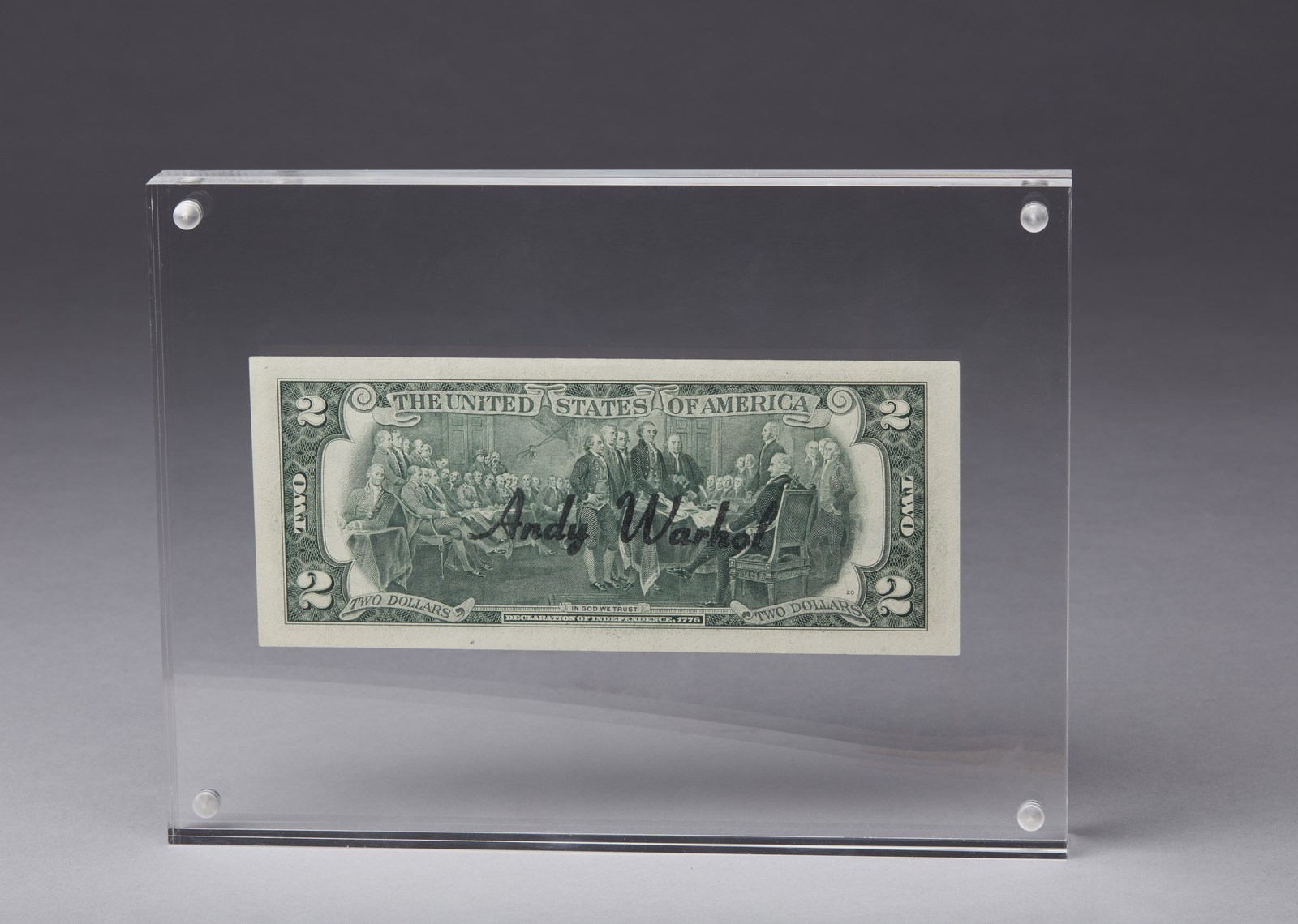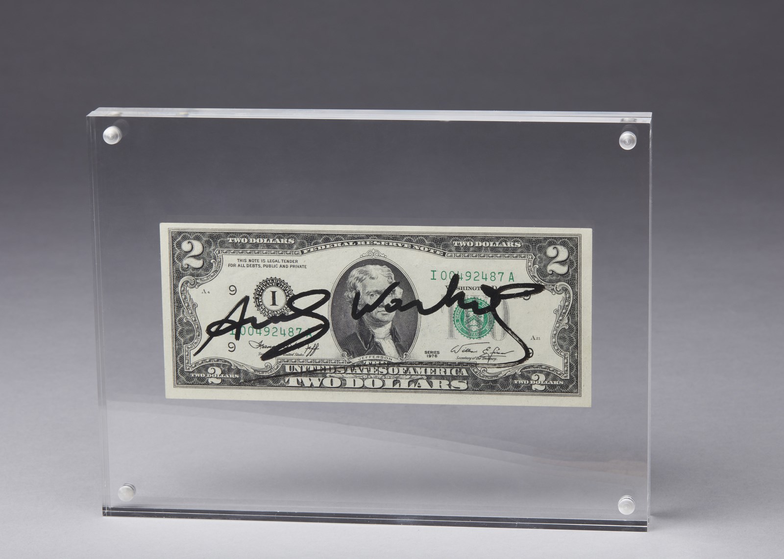 WARHOL ANDY (1928 - 1987) (ATT.TO) Two dollars (Thomas Jefferson). 1976. Intervento su banconota. Cm 15,50 x 6,60. Firma a pennarello. Al retro timbro Andy Warhol. Entro teca di plexiglass. Autentica su fotografia della Galerie 32, Nizza. Lievi difetti. . Cornice presente