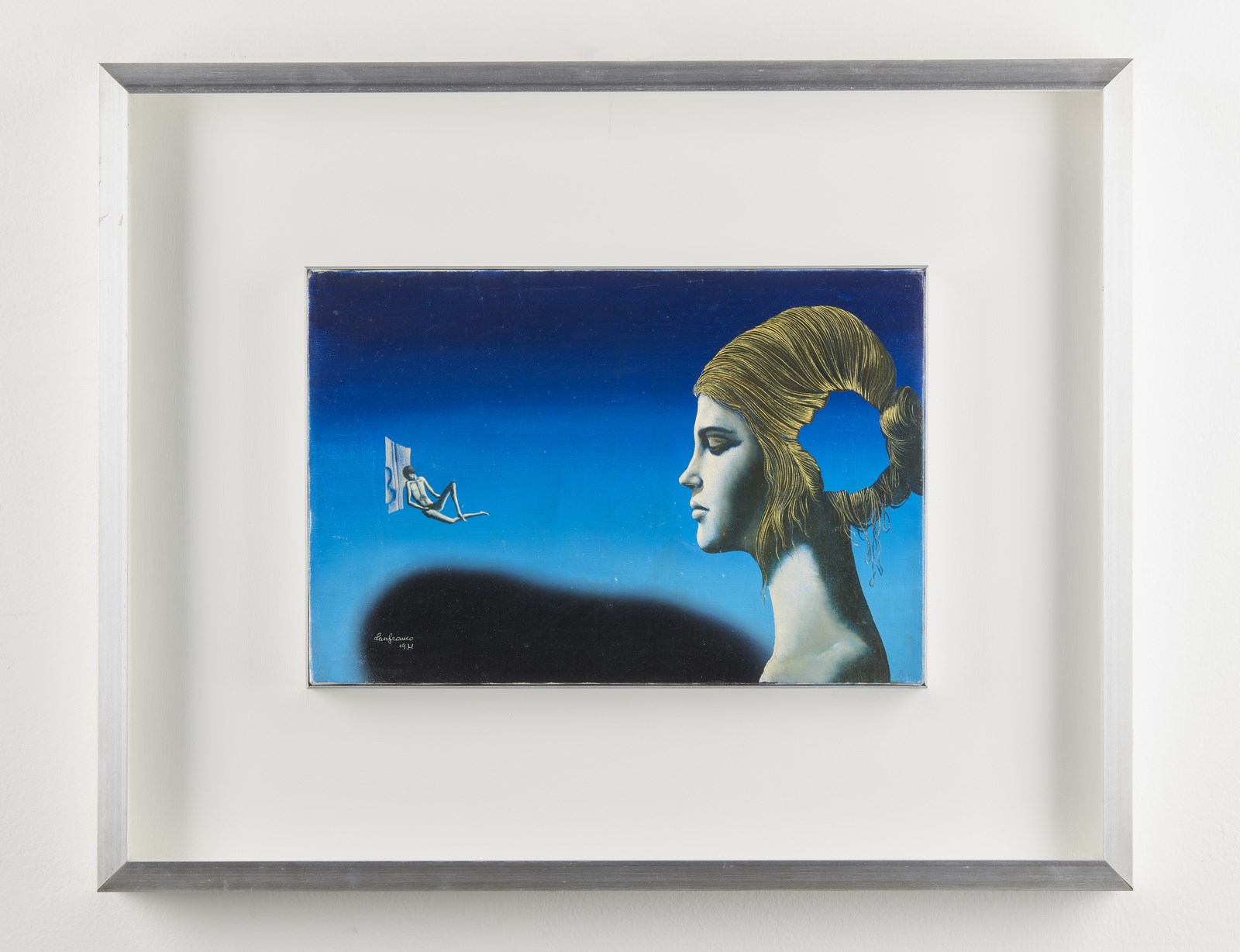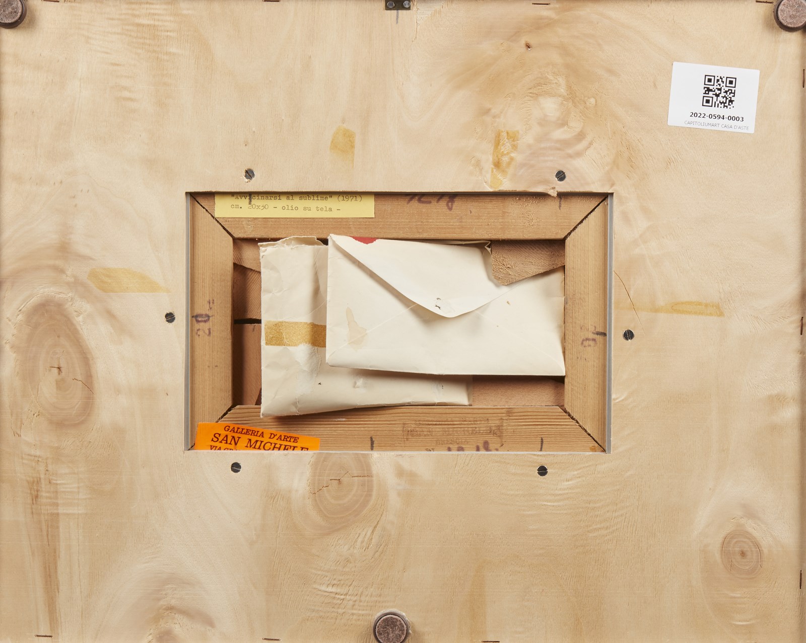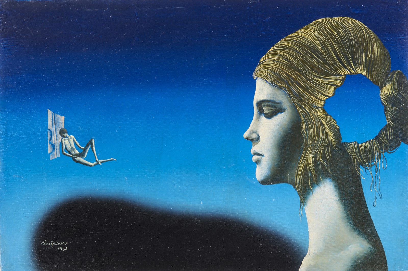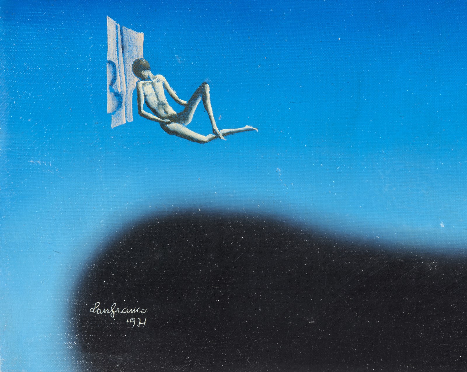 FRIGERI LANFRANCO (n. 1920) Avvicinarsi al sublime. 1971. Olio su tela . Cm 30,00 x 20,00. Firma e anno in basso a sinistra. Firma, titolo e anno al retro. Timbro Galleria d'Arte S.Michele, Brescia. . Cornice presente
