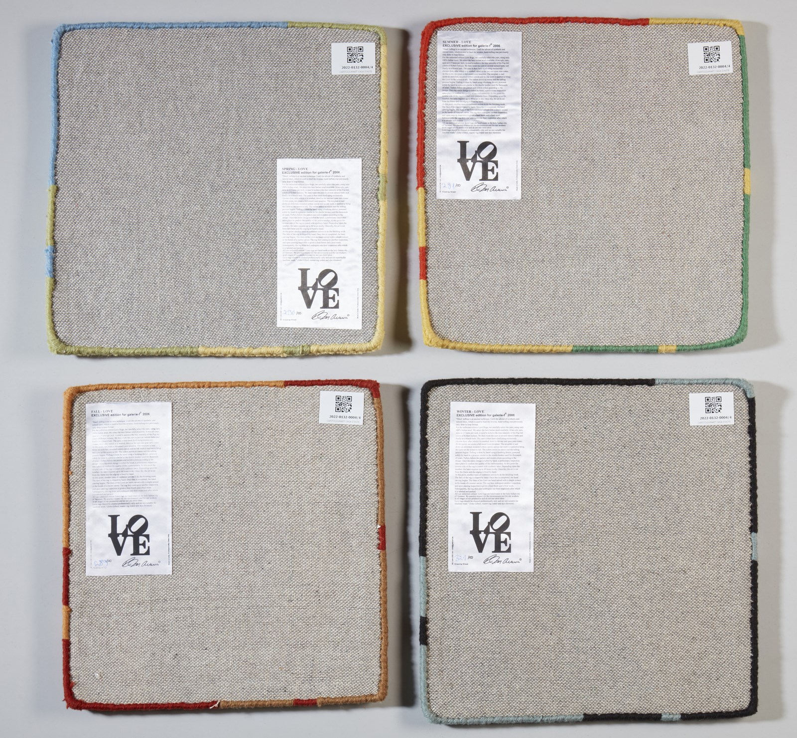 INDIANA ROBERT (1928 - 2018) Lotto composto da n. 4 tappeti. Spring Love, Summer Love, Fall Love, Winter Love. Tappeto. Cm 38,00 x 38,00. Spring Love: n. 296. Al retro cartiglio descrittivo con tiratura e firma a stampa. Exclusive edition for Galerie- F, 2006.