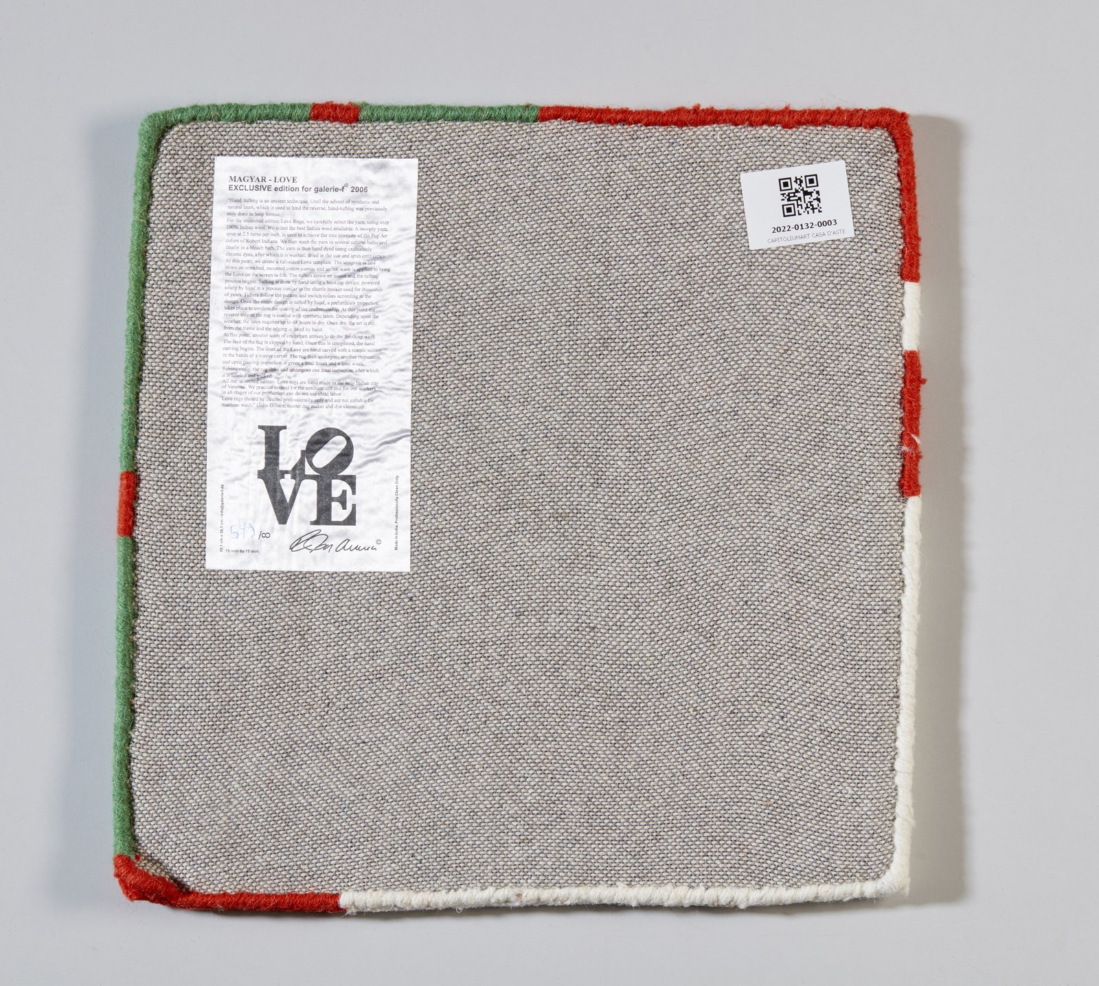 INDIANA ROBERT (1928 - 2018) Magyar Love. Tappeto. Cm 38,00 x 38,00. N. 549. Al retro cartiglio descrittivo con tiratura e firma a stampa. Exclusive edition for Galerie- F, 2006.