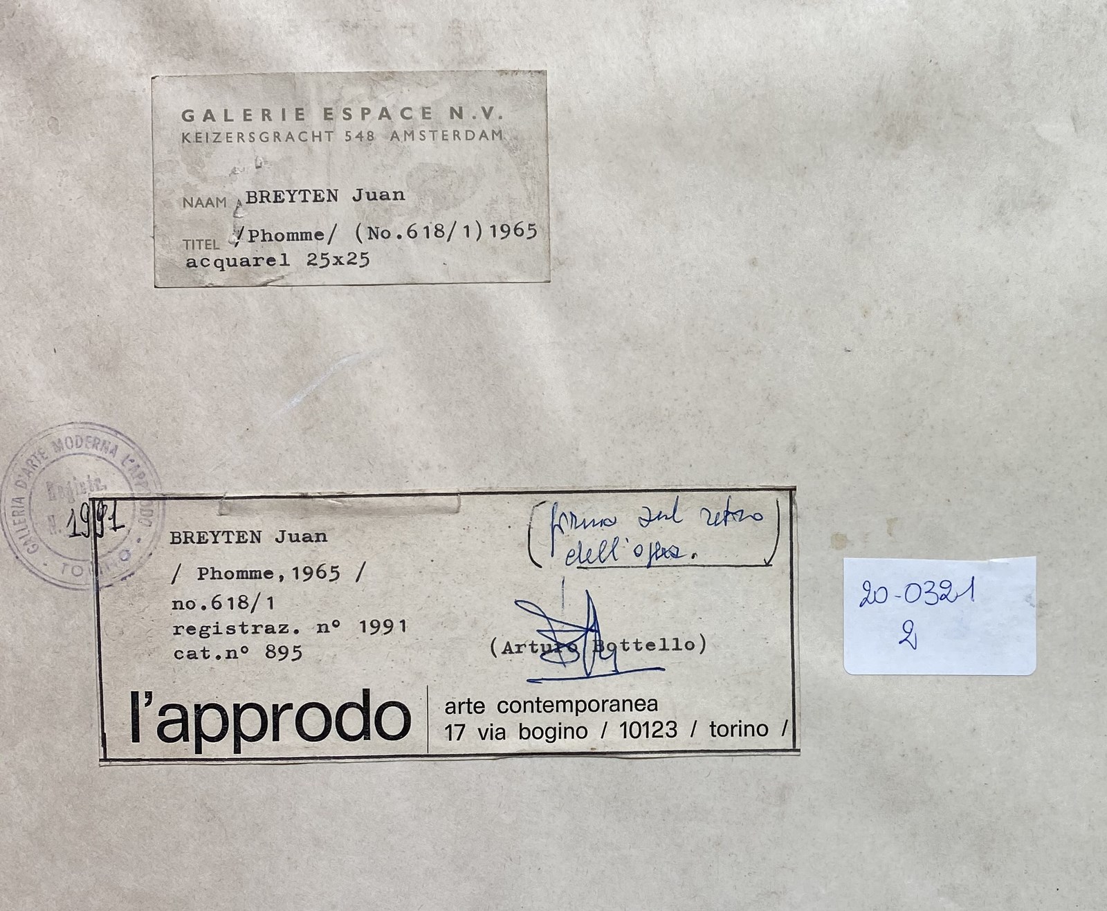 BREYTENBACH BREYTEN (JUAN) (n. 1939) Phomme. 1965. Acquerelli su carta. Cm 25,00 x 25,00. Al retro cartiglio descrittivo Galerie Espance, Amsterdam e Cartiglio descrittivo Galleria L'approdo, Torino.