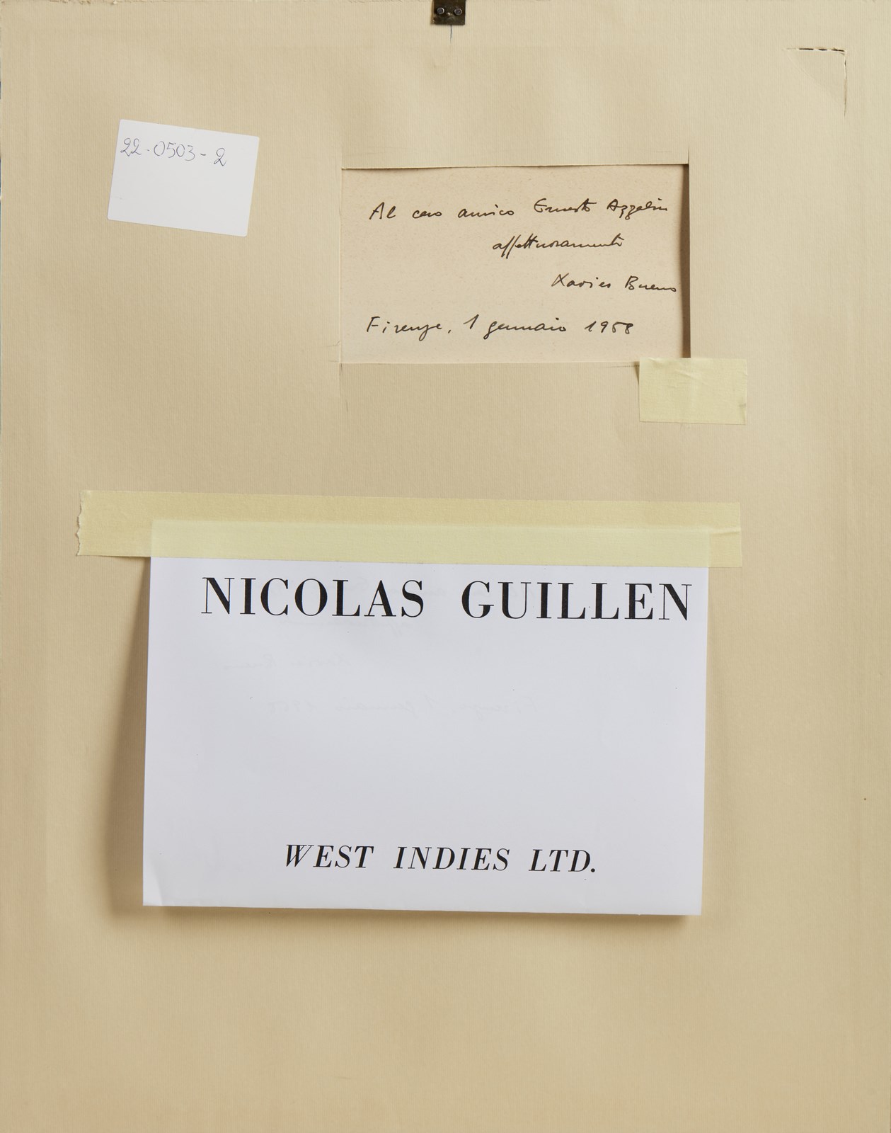 BUENO XAVIER (1915 - 1979) Senza titolo. 1958. Fotolitografia. Cm 23,00 x 33,00. Dedica, firma e anno al retro. Pubblicazione Nicola Guillen, West Indies Ltd. Ed. Cuomo. Lievi difetti. . Cornice presente