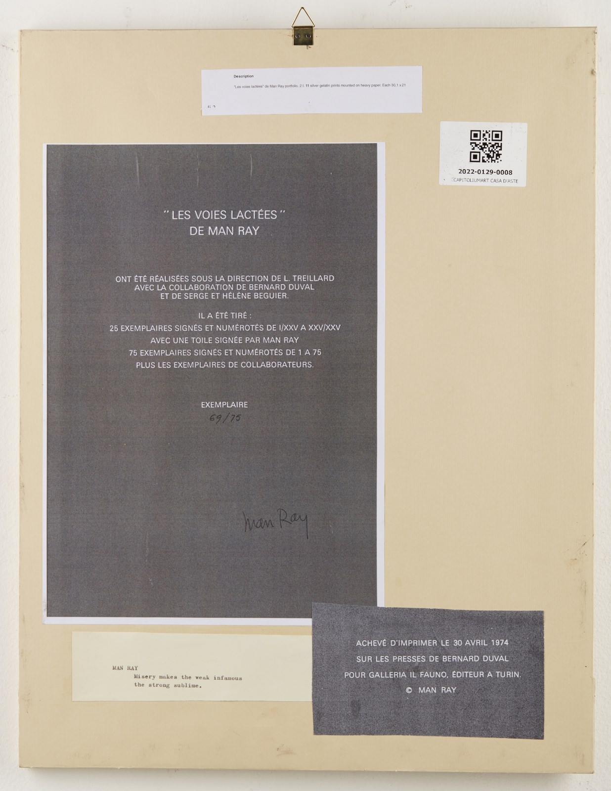 MAN RAY (1890 - 1976) Les Voies lactées. 1974. Stampa alla gelatina d'argento. Cm 21,00 x 30,10. 69/75. Edizione per la Galleria Il Fauno, Torino 1974. Edizione totale: 75 esemplari in numeri arabi +XXV esemplari in numeri romani. Lotto proveniente dal portfolio Les Voies Lactées contente 11 fotografie ai sali d'argento. Lievi difetti.