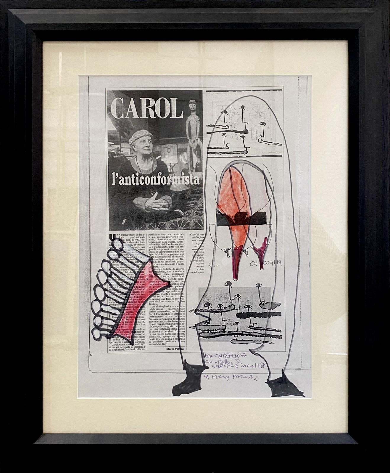 RAMA CAROL (1918 - 2015) La Mucca pazza. 1998. Pennarello e smalto su carta.. Cm 29,50 x 42,00. Firma, anno, titolo e dedica in basso a destra. Opera archiviata presso l'Archivio Carol Rama, Torino, come da documentazione fotografica allegata all'opera riportante il relativo numero d'inventario. Cornice presente