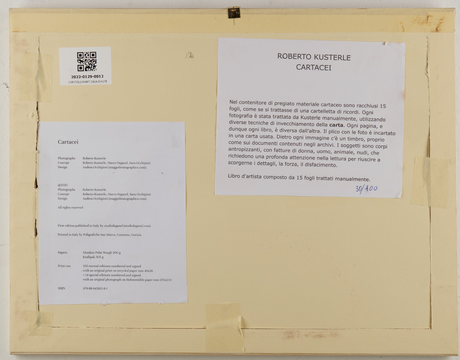 KUSTERLE ROBERTO (n. 1948) Dal libro Cartacei. 2020. Fotolitografia. Cm 27,00 x 21,00. 30/100 Edizione totale: 100 copie numerate e firmate + 14 esemplari numerati e firmati con fotografia originale su carta Hahnemuhle.Timbro sul retro: Cartacei Kunsterle. Stampata in Italia da Poligrafiche S.Marco (GO). . Cornice presente