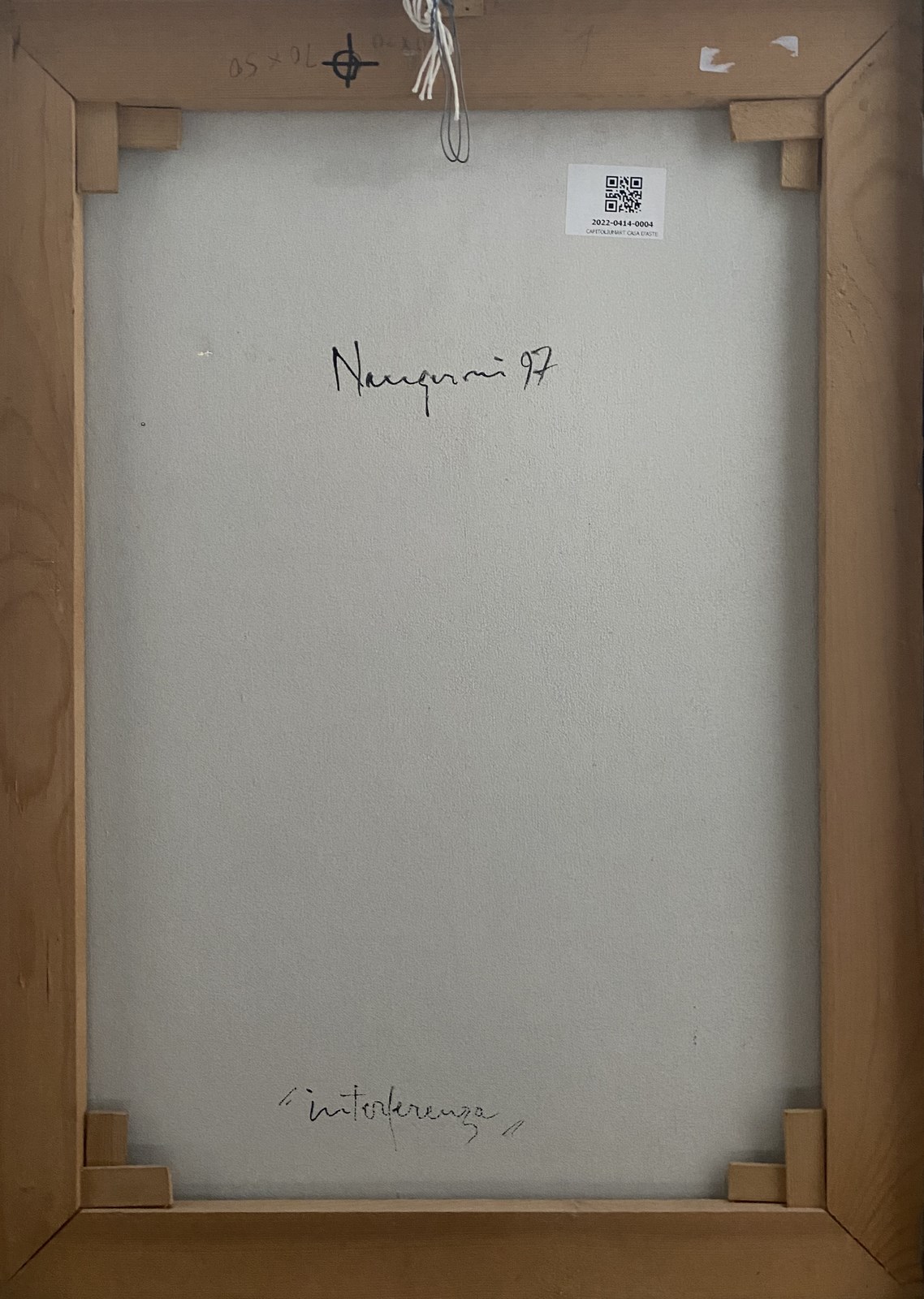 NANGERONI CARLO (n. 1922) Interferenza. 1997. Acrilico su tela. Cm 50,00 x 70,00. Firma, titolo e anno al retro. Opera archiviata presso l'Archivio Carlo Nangeroni, Brescia, come da documentazione fotografica allegata all'opera riportante il relativo numero d'inventario. Lievi difetti. Cornice presente
