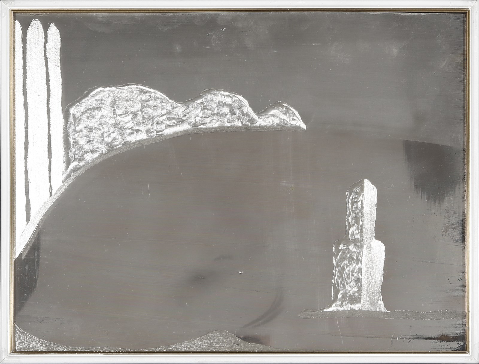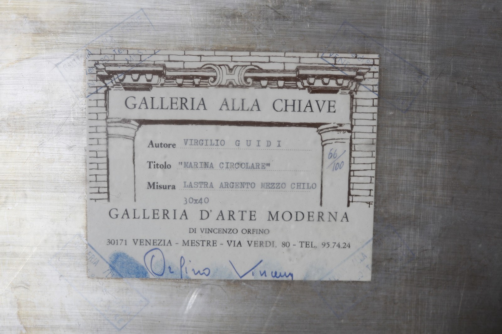 GUIDI VIRGILIO (1891 - 1984) Marina circolare. Serigrafia su lastra argentata.. Cm 40,00 x 30,00. 66/100. Firma incisa in basso a destra. Al retro tiratura e cartiglio descrittivo Galleria Alla Chiave, Venezia. Lievi difetti. Cornice presente