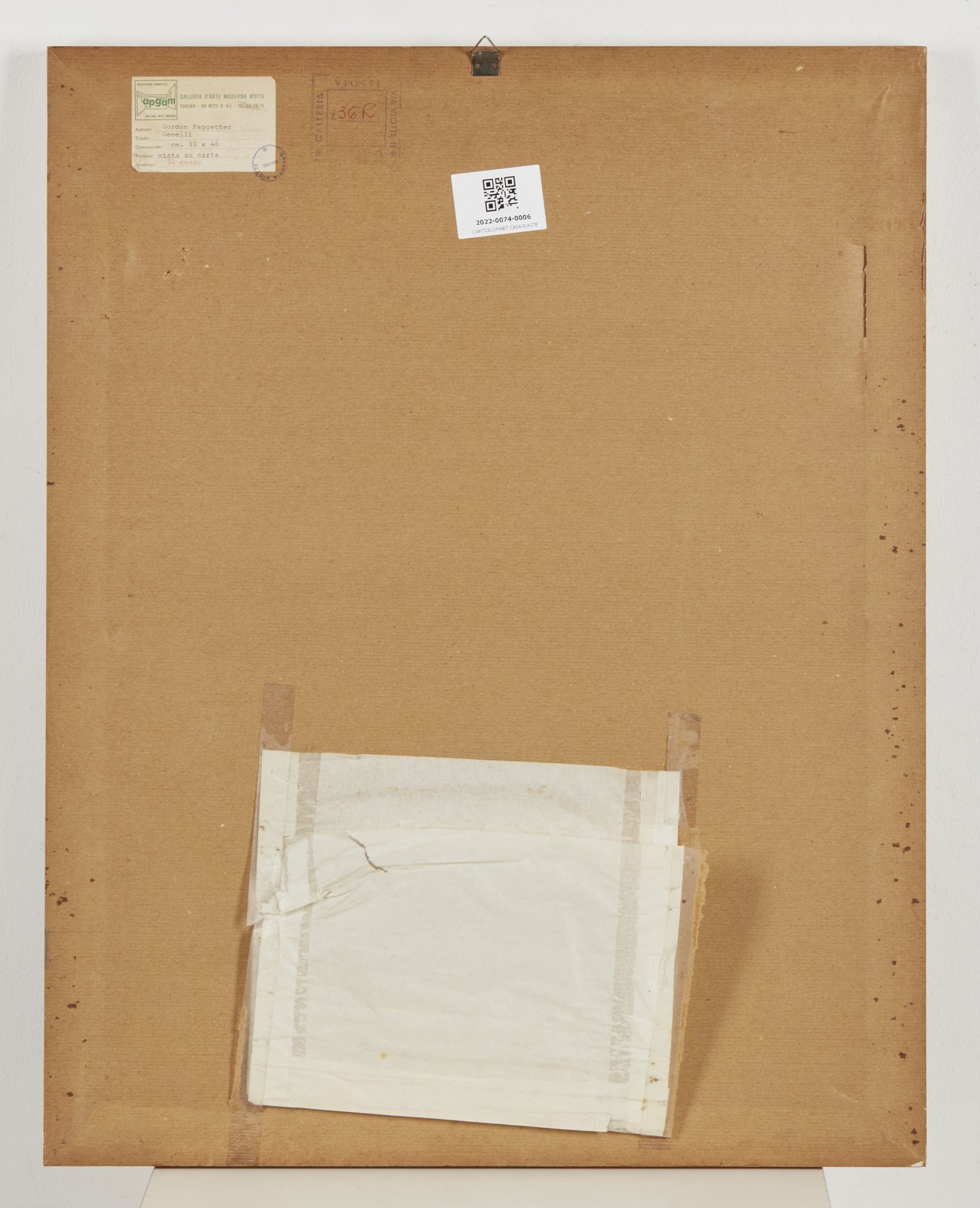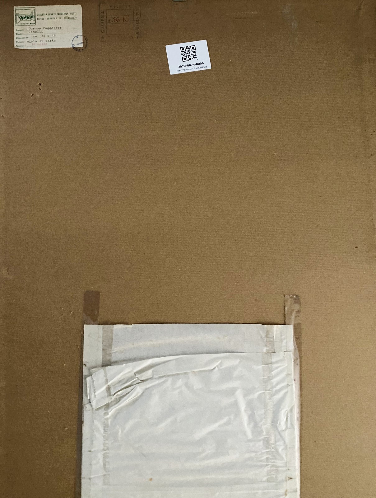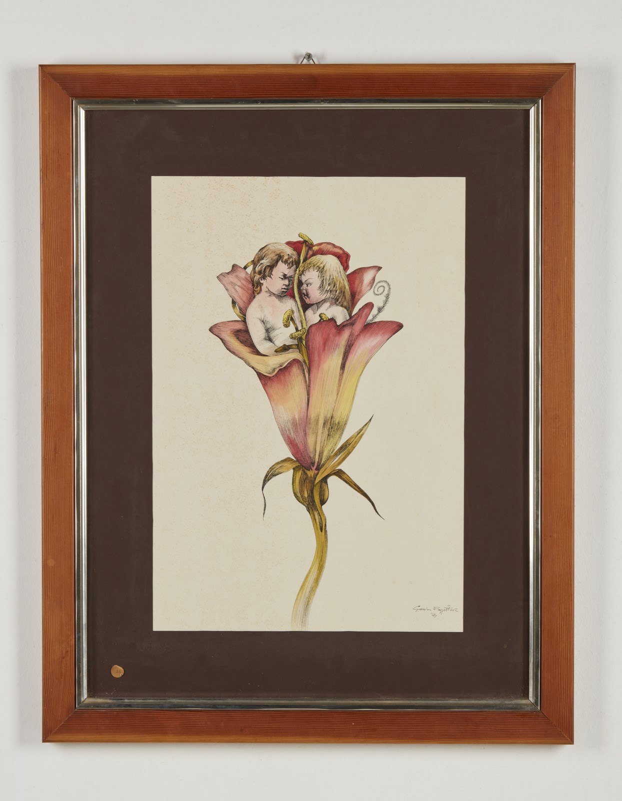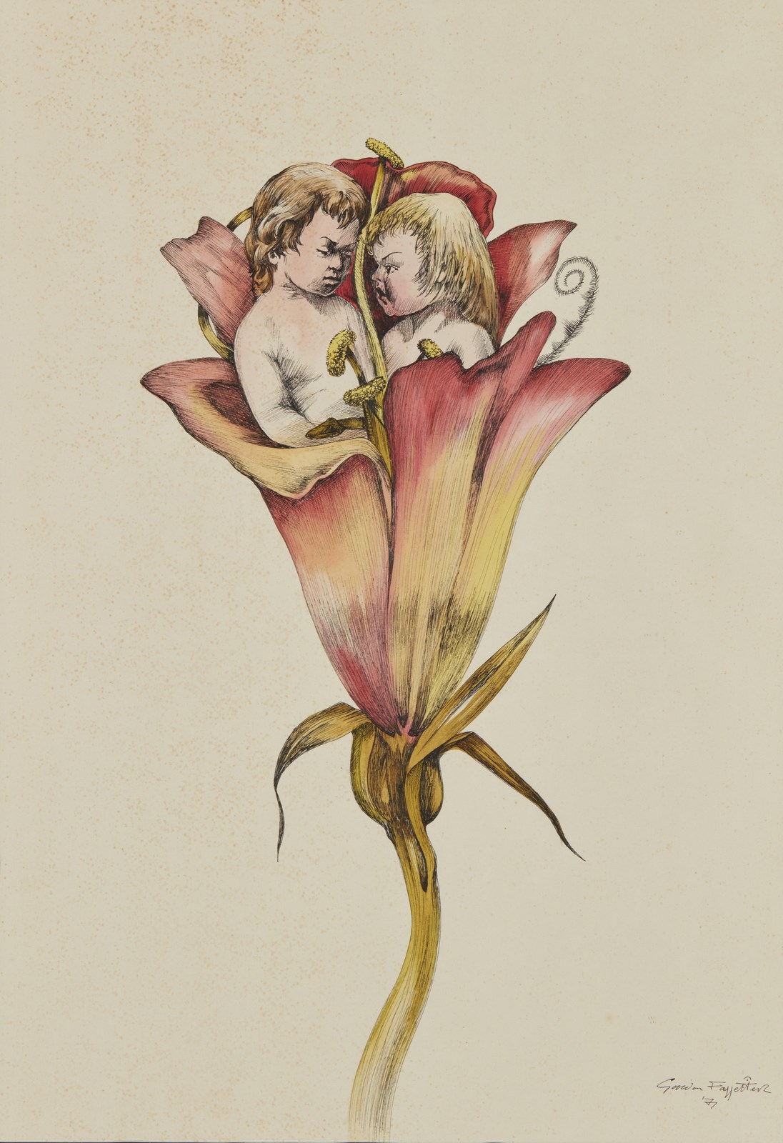 FAGGETER GORDON (1948 - 2020) Gemelli. 1971. Tecnica mista su carta. Cm 32,00 x 46,00. Firma e anno in basso a destra. Al retro, cartiglio e timbro Galleria Viotti, Torino. Fu il primo marito della cantante Patty Pravo e membro del suo gruppo musicale. Difetti. . Cornice presente