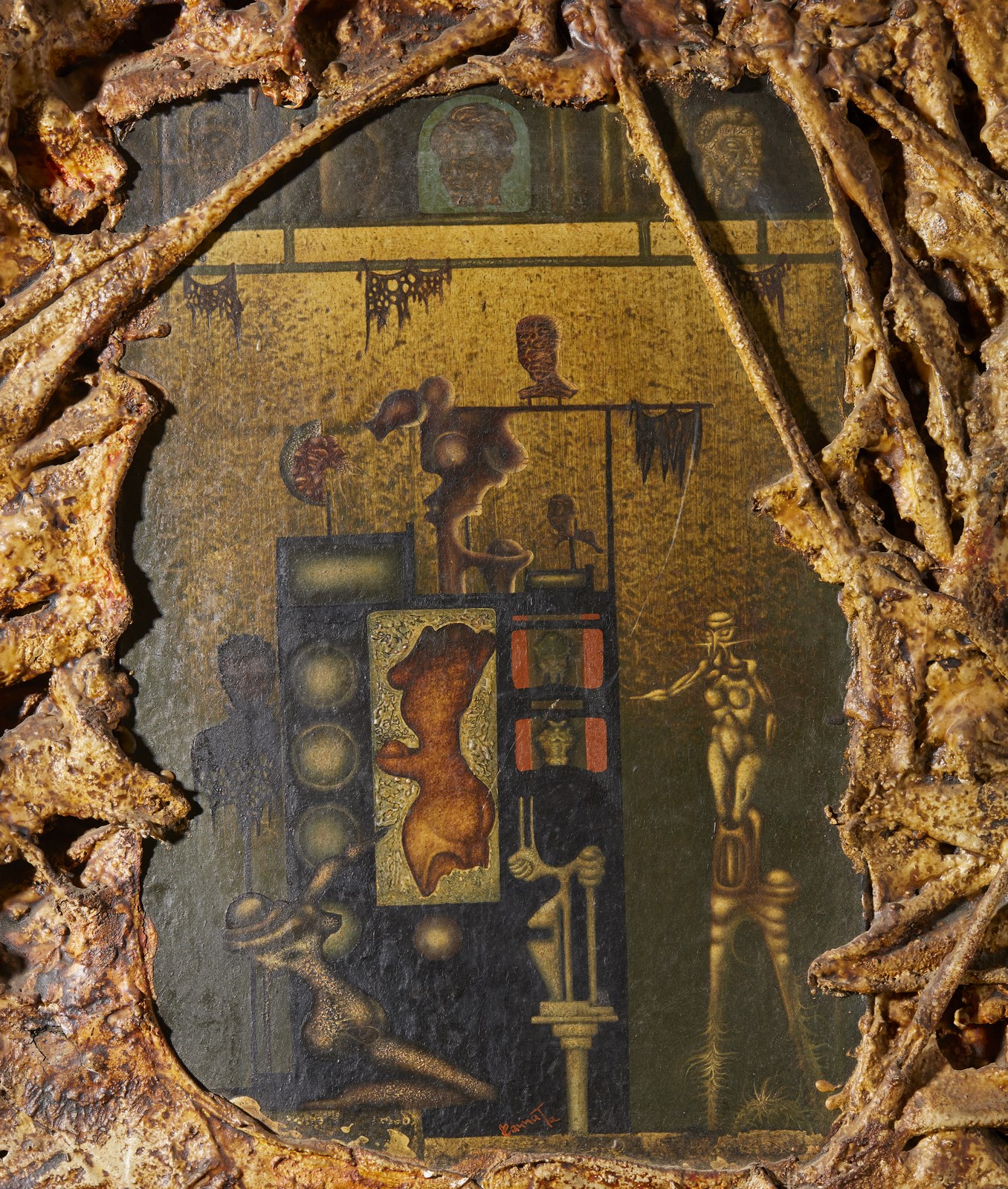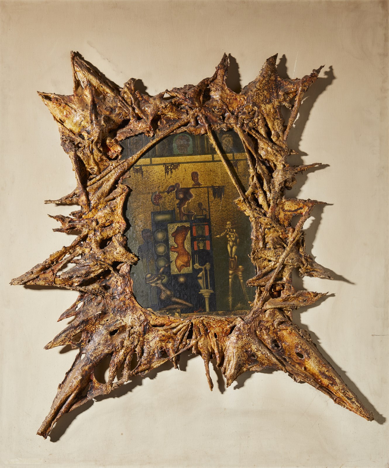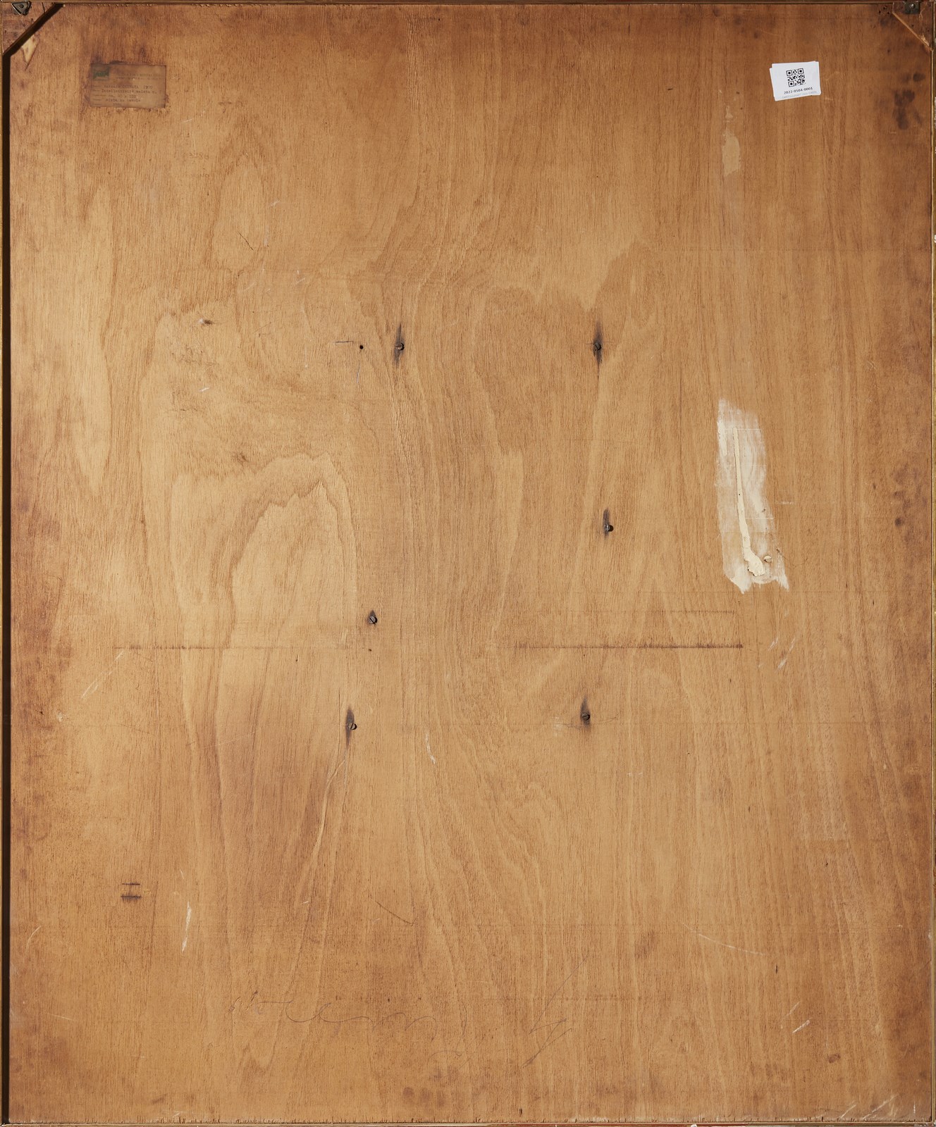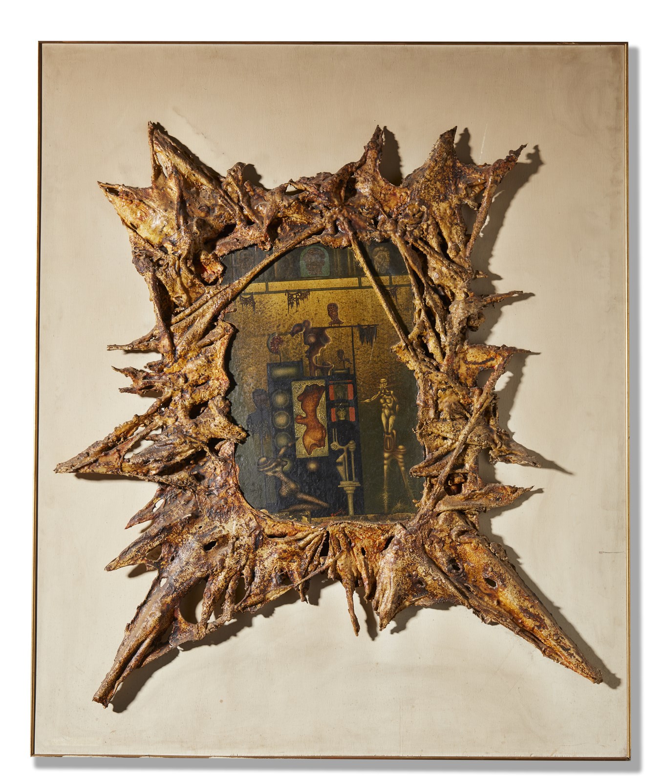 . 1970. Tecnica mista su tavola. Cm 90,00 x 110,00. Firma in basso al centro. Al retro cartiglio descrittivo Galleria Viotti, Torino. Difetti. . Cornice presente