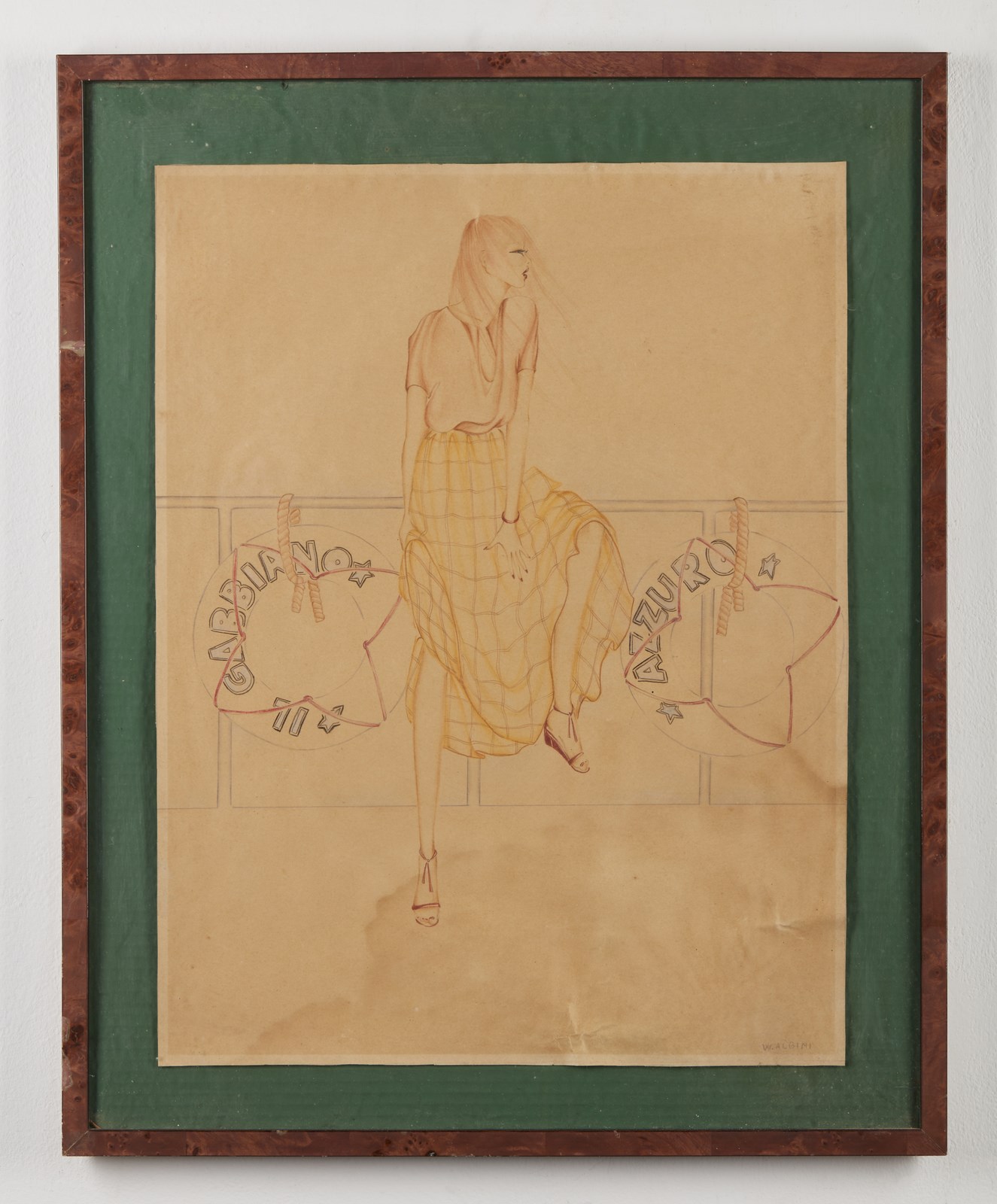 ALBINI WALTER (1941 - 1983) Il Gabbiano Azzurro. Tecnica mista su carta. Cm 38,50 x 50,00. Bozzetto di moda. . Cornice presente