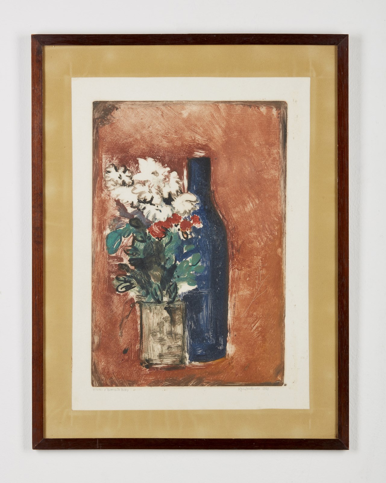 LOMBARDO UGO (n. 1922) Fiori e bottiglia bleù. . 1969. Litografia. Cm 33,00 x 45,00. Firma, titolo e anno in basso a matita. Lievi difetti. Autentica su fotografia di Focosi Alessandra e Focosi Silvana.