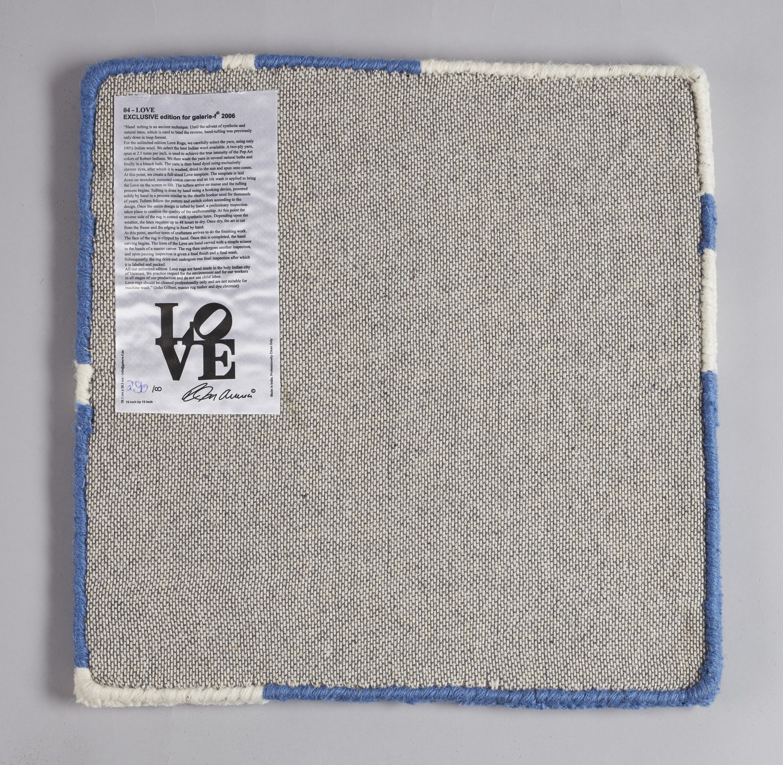 INDIANA ROBERT (1928 - 2018) 04 Love. Tappeto. Cm 38,00 x 38,00. N.290. Edizione limitata per la Galerie - F, 2006. Al retro cartiglio con firma a stampa e tiratura a penna